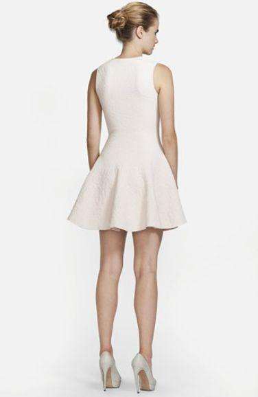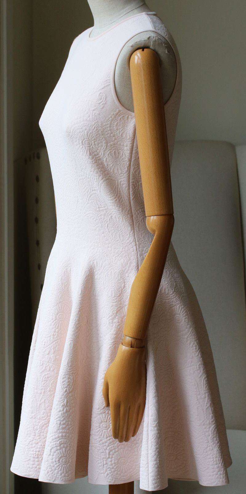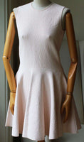 Pale pink jacquard A-line dress from Alexander McQueen featuring a round neck, a fitted waist and a flared and pleated skirt.