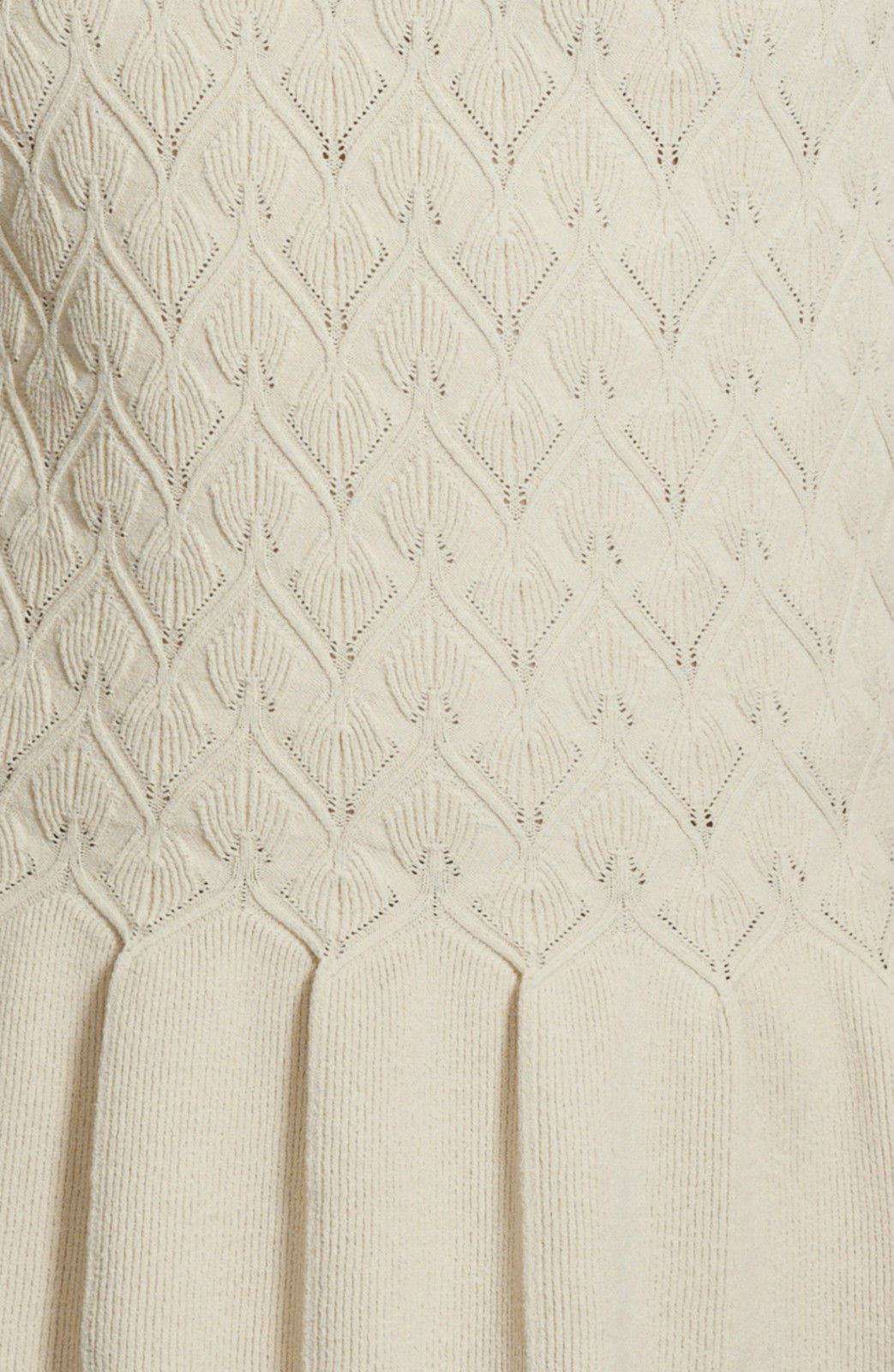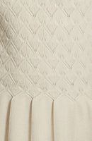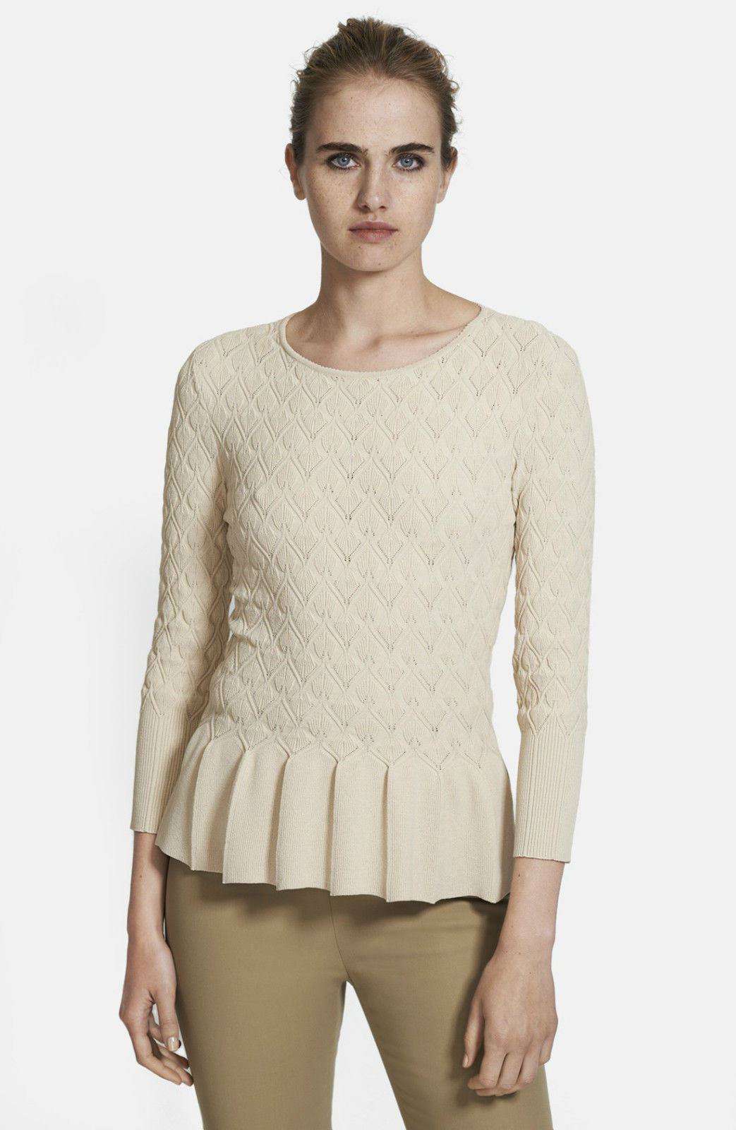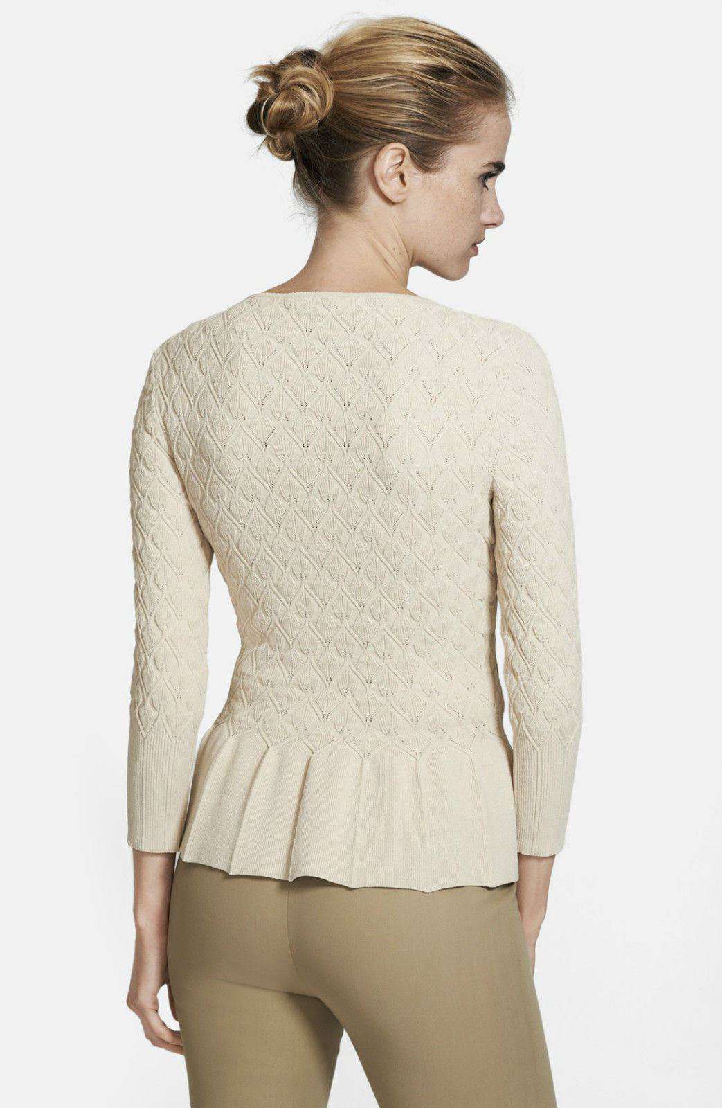 A pointelle-detailed diamond-knit pattern lends tactile dimension to a fitted three-quarter-sleeve sweater eased by a pleated peplum hem. 75% rayon, 25% polyester. Dry clean. Collectors. Color: Cream