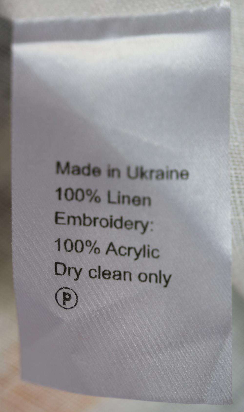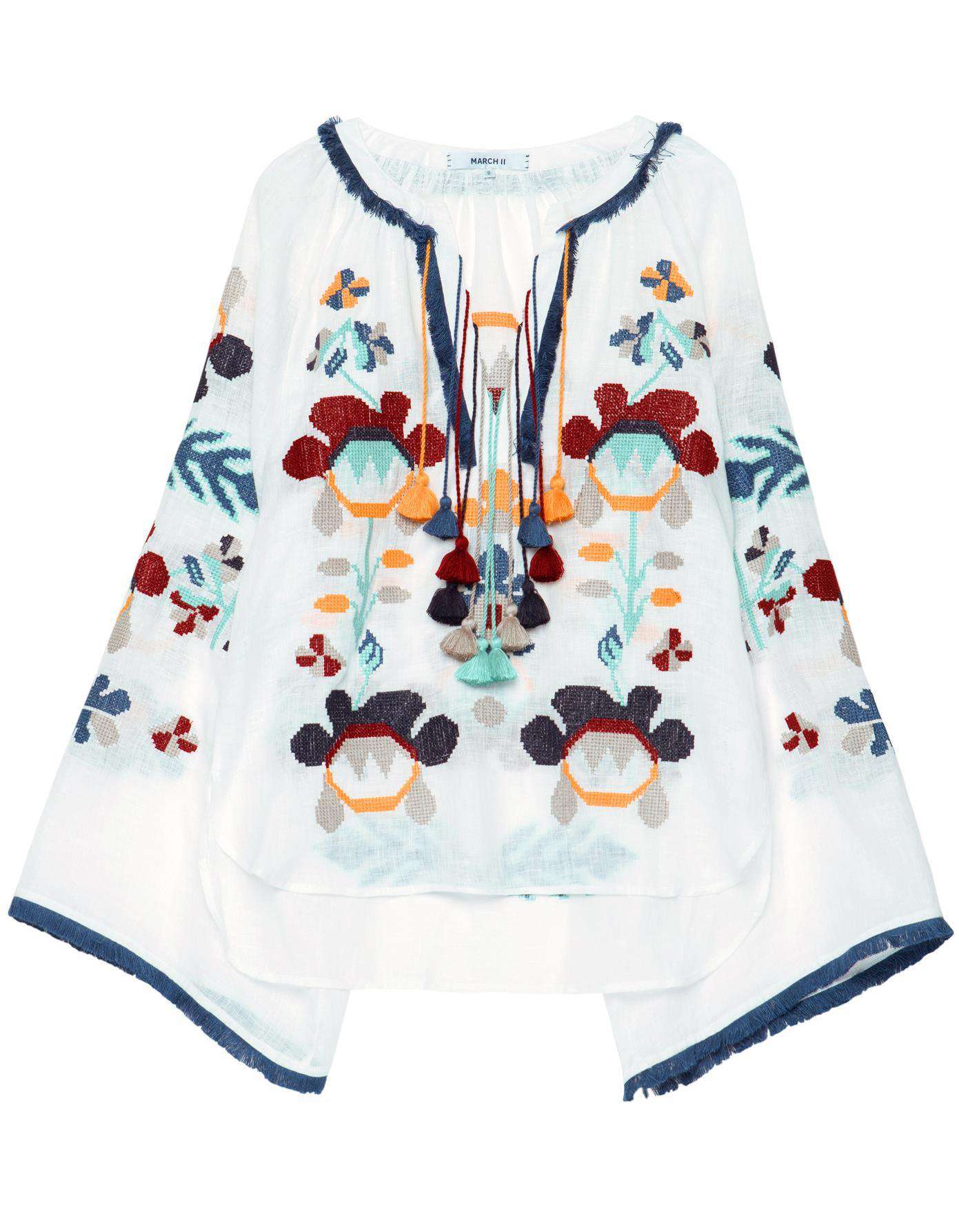 This March11 Astrid Embroidered Blouse features multiple colorful tassels with trumpet sleeves and frayed edges. Hand embroidered design. Plunging split neckline. Unlined. 100% Linen. Size: Small (UK 8, US 4, FR 36, IT 40)