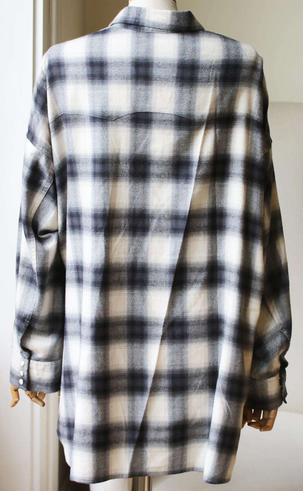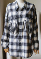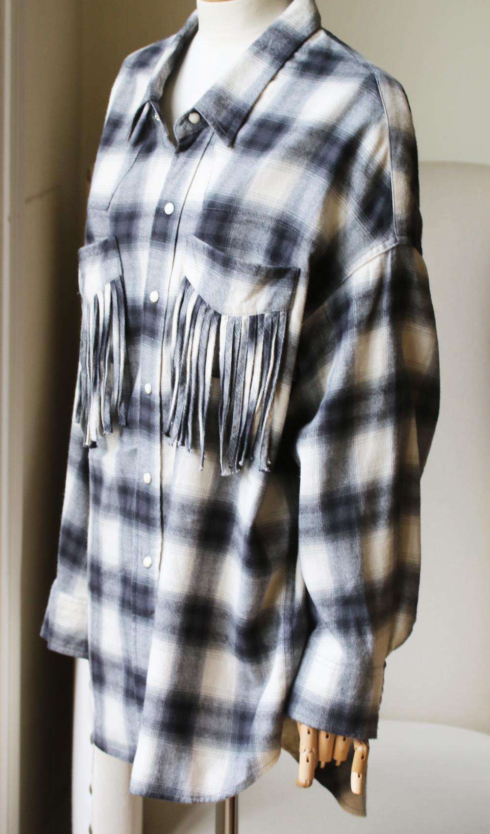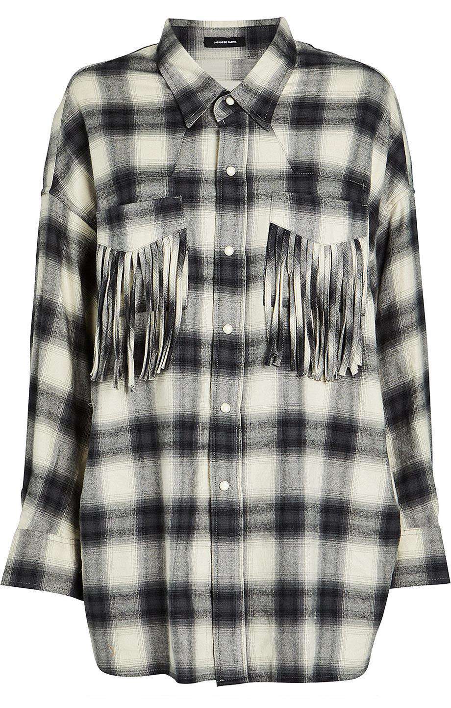 - R13's flannel gets an update for the new season; at the front, you'll notice fringed details that give this piece its western edge.