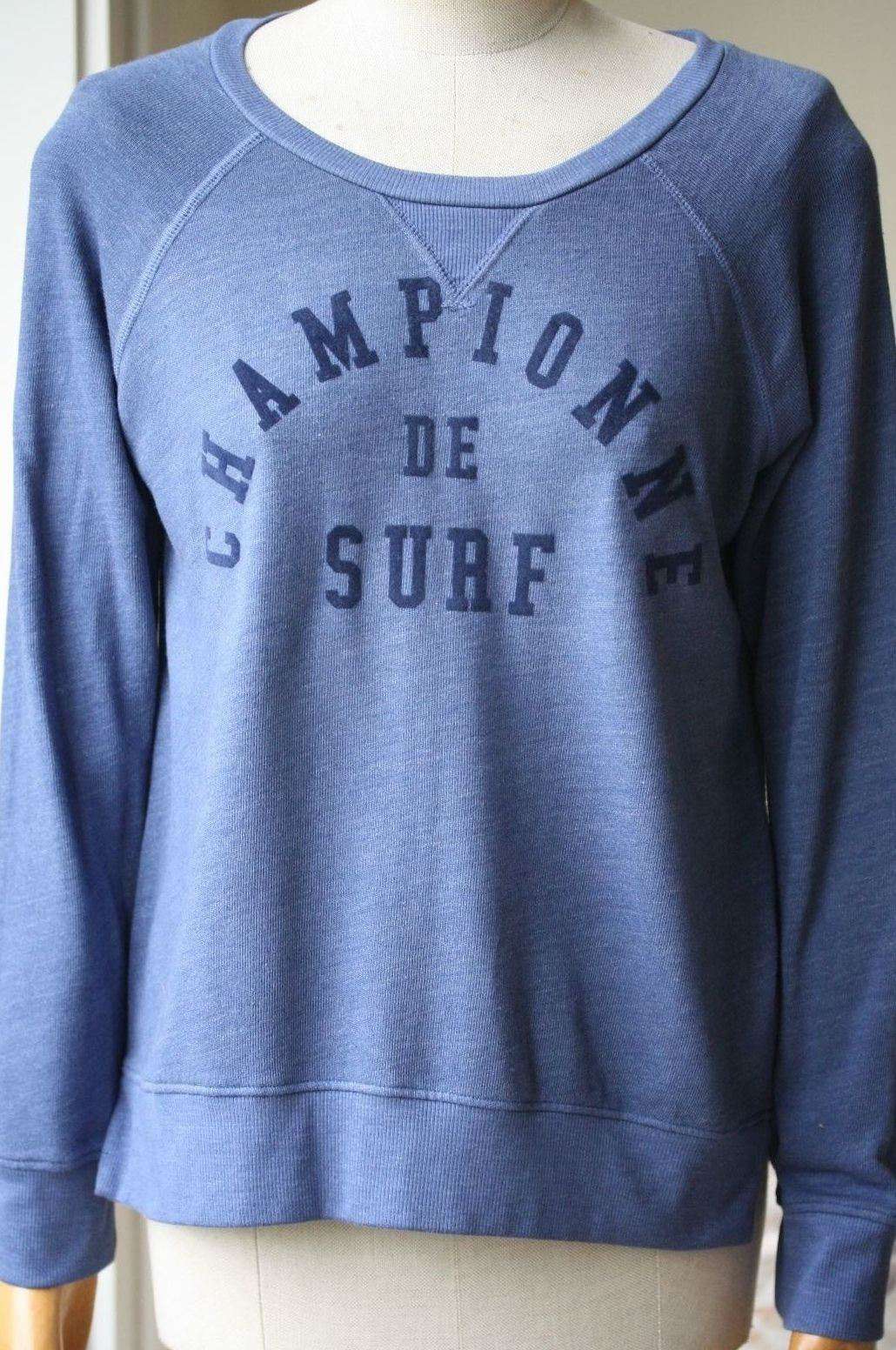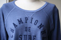 Bold 'Championne De Surf' lettering details the front of this lightweight sweatshirt. Overlock seams. Banded edges. Long raglan sleeves.