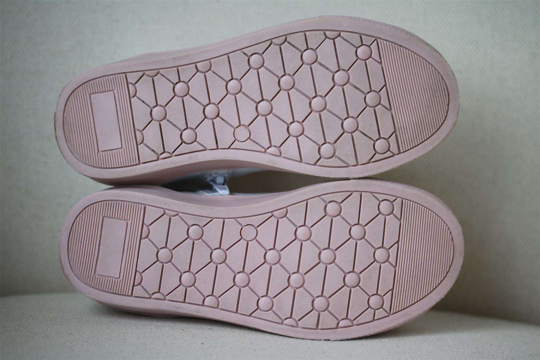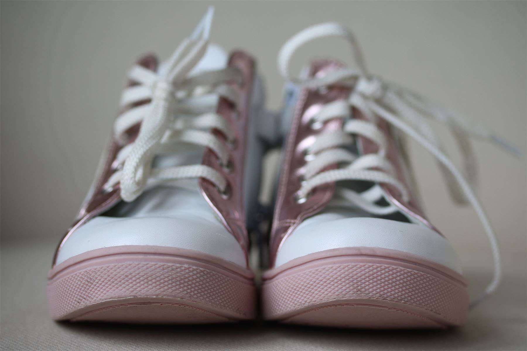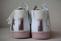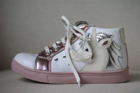 Girls pink & white high-top trainers by British brand Step2wo, decorated with a cute unicorn on the side and a metal heart logo badge. They have laces and a convenient zip with velcro tab down one side of the shoe to help make dressing quick and easy.