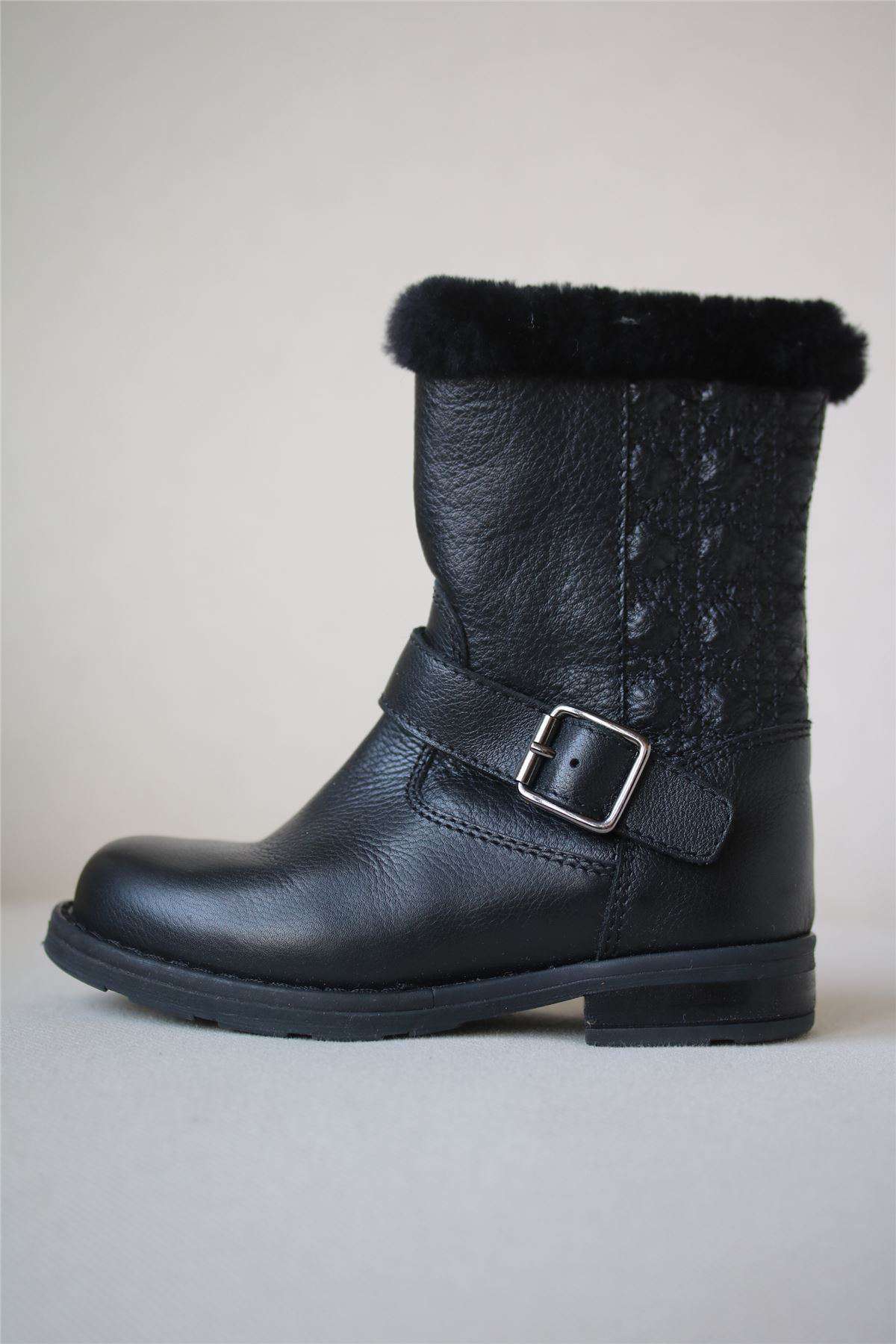 Girls black leather boots by Dior. They have a shearling lining and cannage detailing on the leg. They have a zip fastening on the inside of the leg for easy changing.