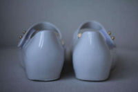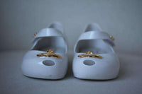 Designed in collaboration with Vivienne Westwood, these white 'Anglomania' jelly shoes have the unique and unmistakable Mini Melissa scent. Made in soft and flexible PVC, there is an adjustable strap that fastens with velcro and a gold Vivienne Westwood orb motif on the toes. Size - EU 25-26 (UK 8, US 9)