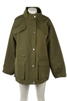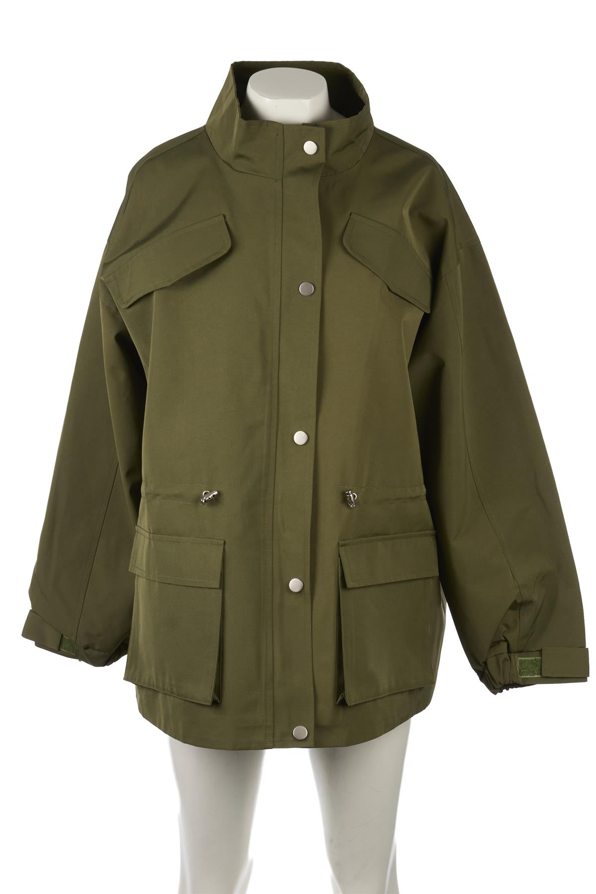 Meotine Green Tracey Shell Jacket. Green. Long Sleeve. Mock Neck. Button fastening - Front. 100% Polyester, 90% Polyester, 10% Elastane. XSmall (UK 6, US 2, FR 34, IT 38). Shoulder to Shoulder: 23.5 in. Bust: 52 in. Waist: 53 in. Hips: 54 in. Length: 32 in.