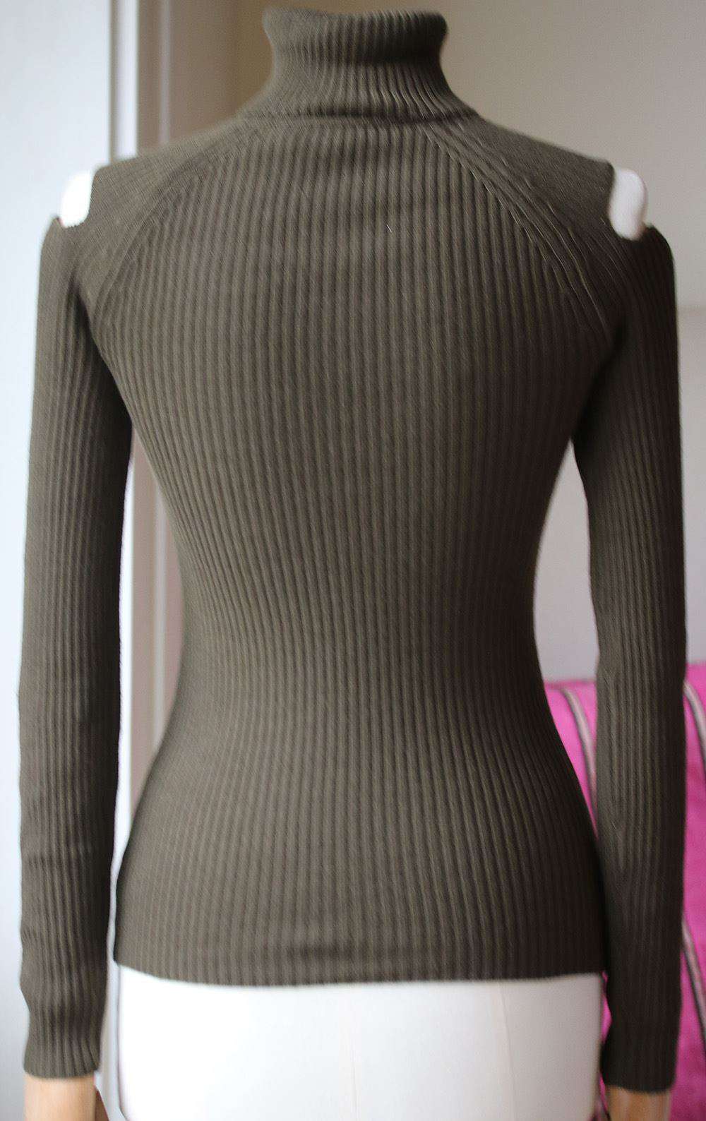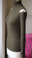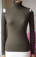 Theory's 'Jemliss' sweater has a thick and cozy turtleneck offset by shoulder cutouts. It's knitted from a ribbed wool-blend that enhances the flattering close fit. Khaki wool-blend. Slips on. 94% wool, 6% polyester.