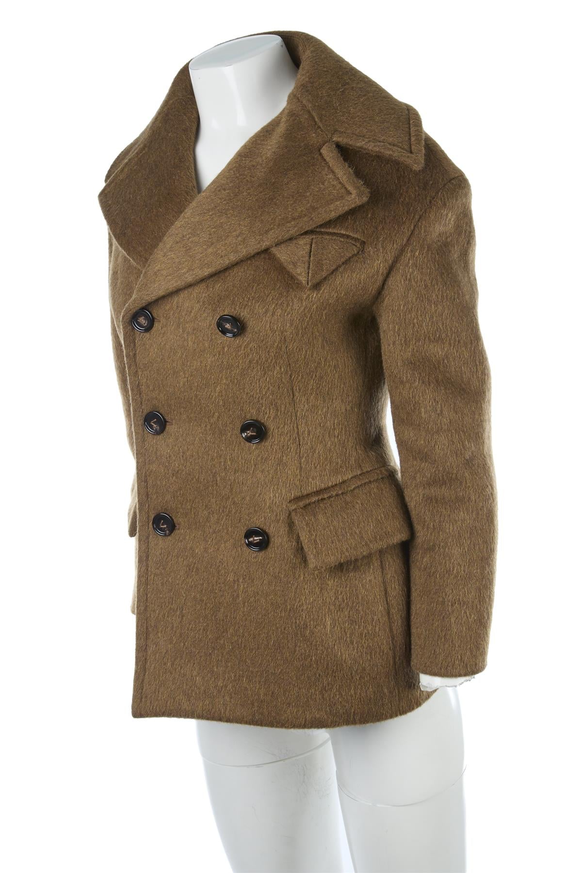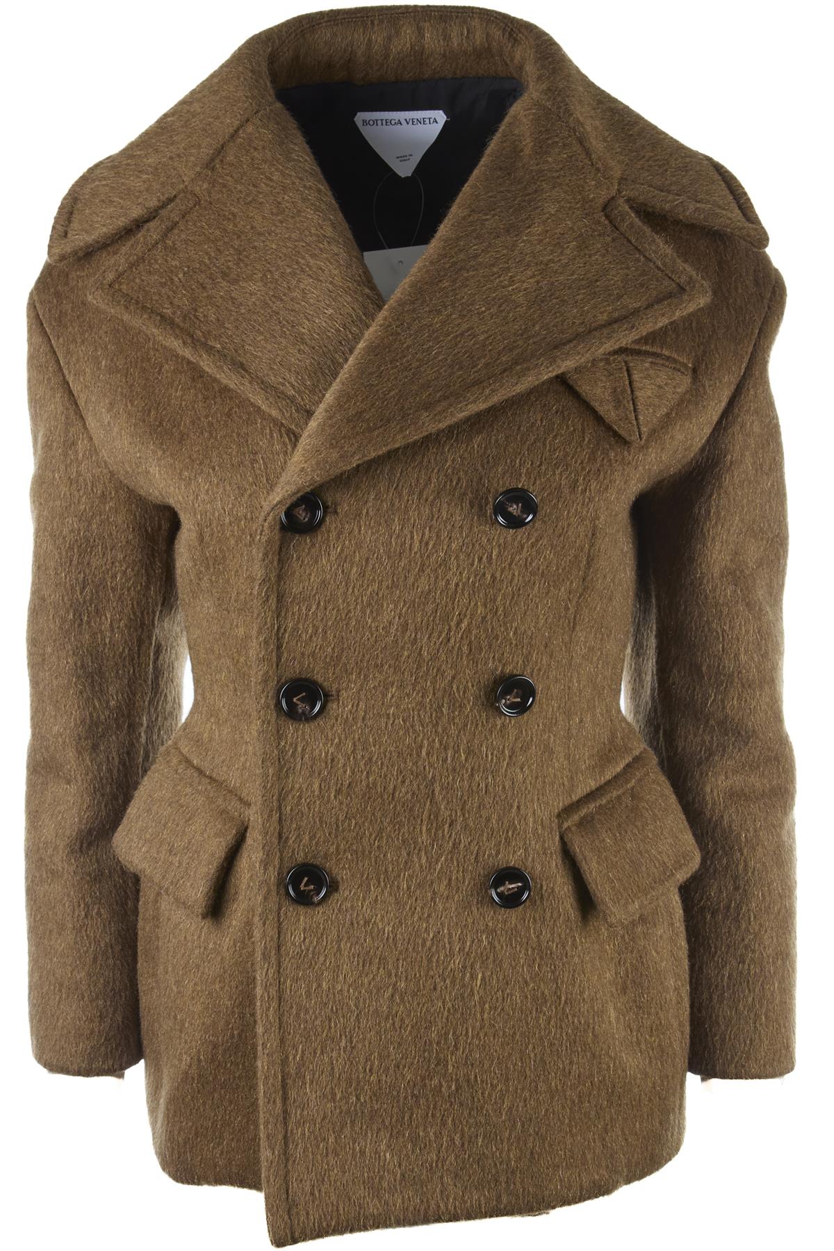 Bottega Veneta Khaki Wool Jacket. Khaki. Long Sleeve. V-Neck. Button fastening - Front. 50% Wool, 30% Mohair, 20% Polyamide, 100% Viscose. IT 34 (UK 2, US 00, FR 30). Shoulder to Shoulder: 18 in. Bust: 32 in. Waist: 29 in. Hips: 34 in. Length: 28 in.