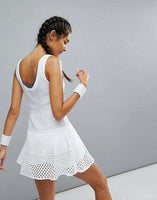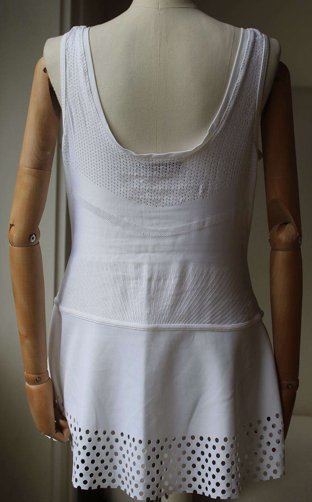 A sporty adidas by Stella McCartney tennis dress gains a flirty touch from laser-cut trim at the hem. Inset mesh panels accent the bodice. Unlined. Fabric: Activewear jersey. Shell: 88% polyester/12% spandex.