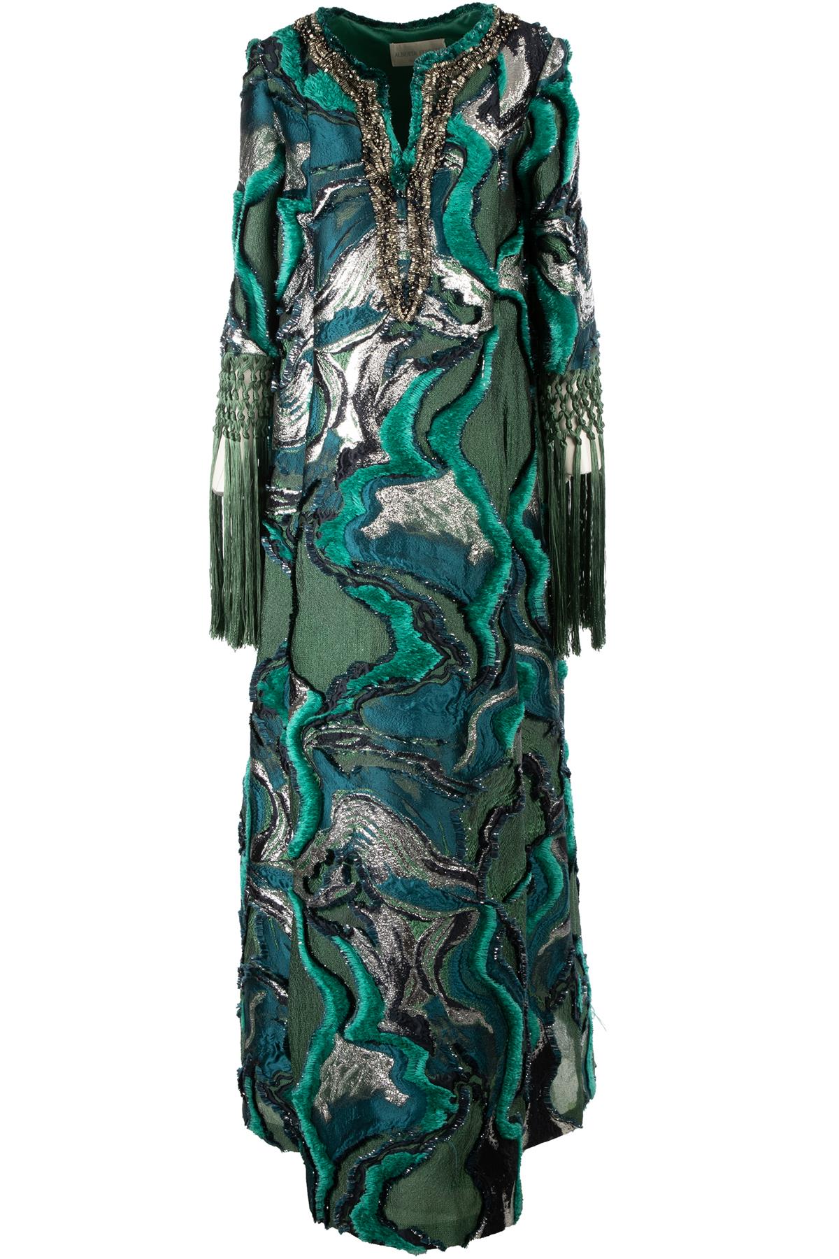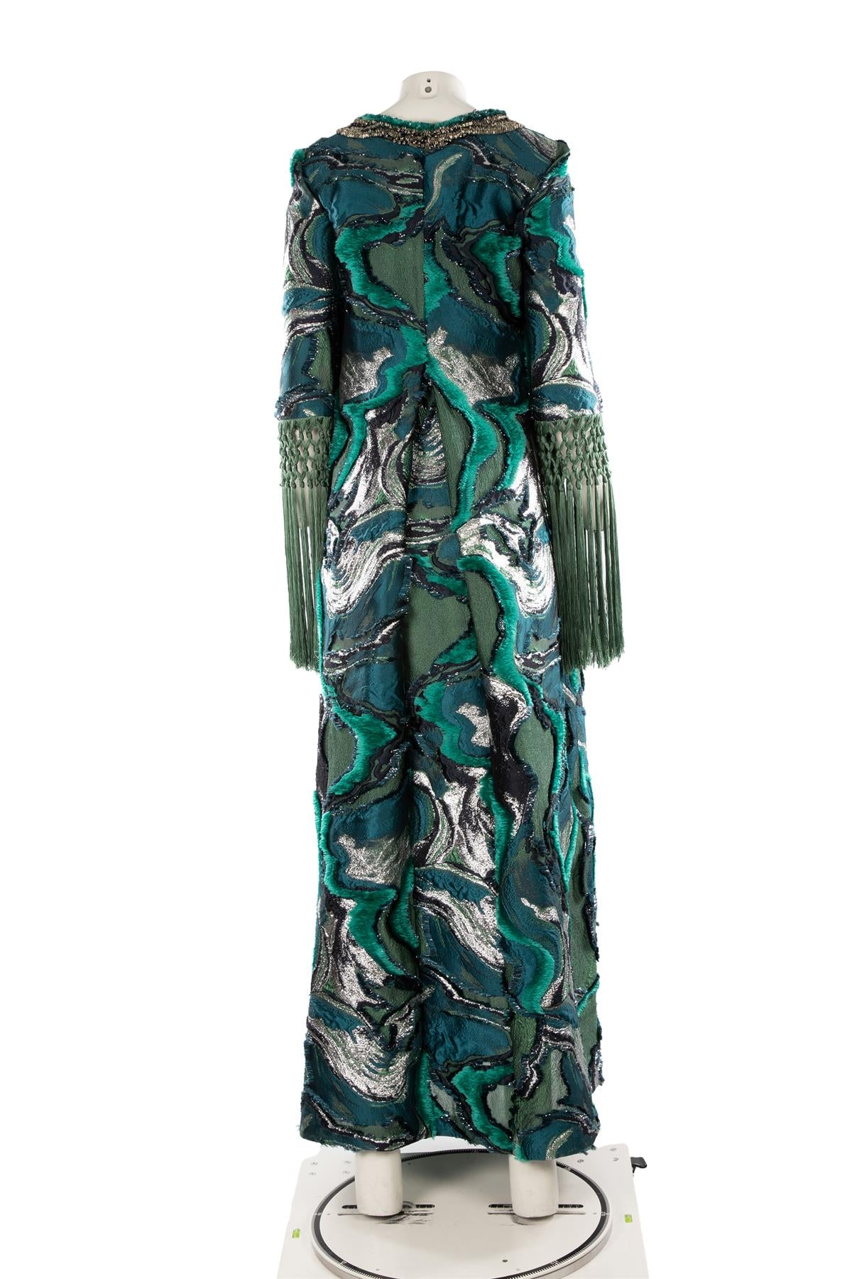 Alberta Ferretti Green 2016 Silk Gown. Green. Long Sleeve. V-Neck. Pull on. 66% Polyester, 16% Acetate, 8% Silk, 6% Metal, 4% Other fibres. IT 38 (UK 6, US 2, FR 34). Bust: 37 in. Waist: 42 in. Hips: 64 in. Length: 58 in.
