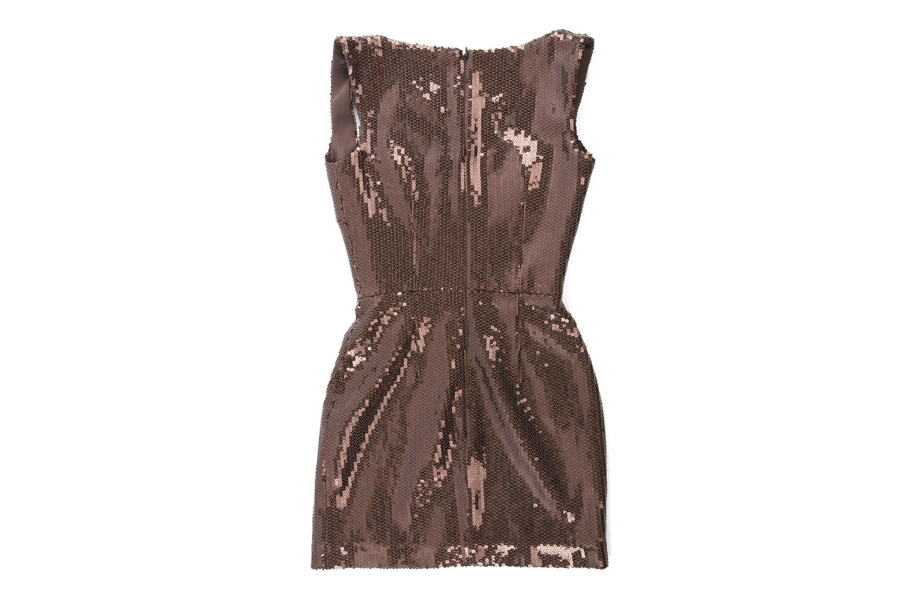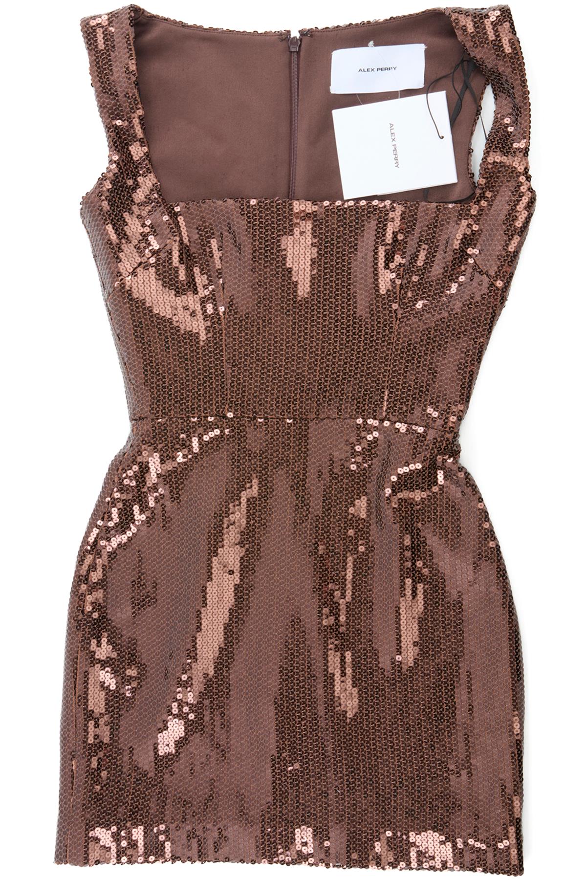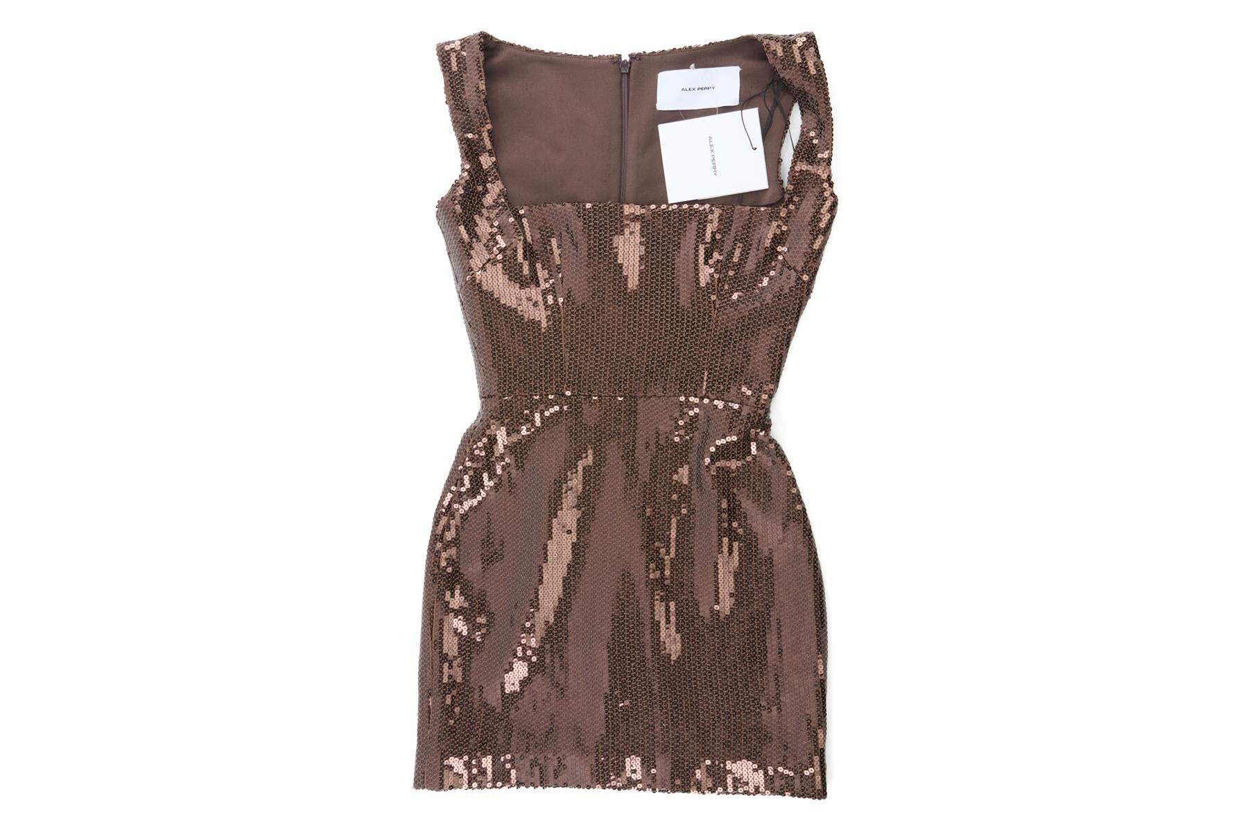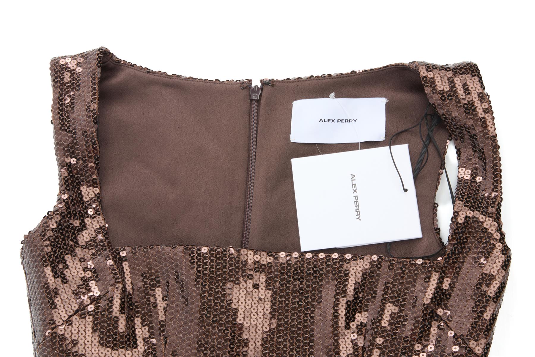 Alex Perry Brown Sequin Mini Dress. Brown. Sleeveless. Square Neck. Zip fastening - Back. 95% Polyester, 5% Elastane, 80% Acetate, 20% Polyester. UK 4 (US 0, FR 32, IT 36). Bust: 28 in. Waist: 23 in. Hips: 31 in. Length: 27 in.