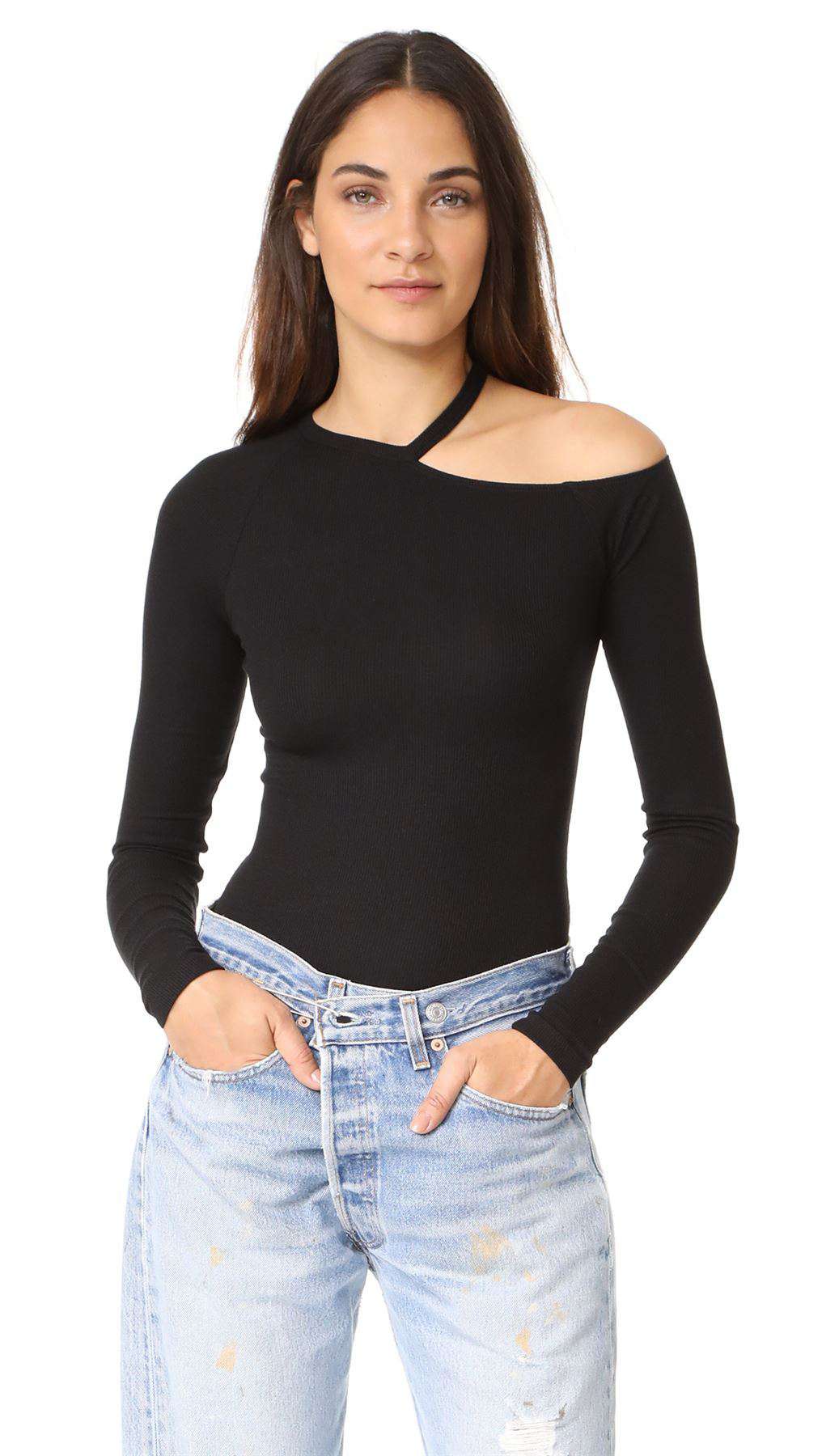 An asymmetrical cutout adds edgy style to this super-soft Alix bodysuit. Long sleeves. Snap gusset. Fabric: Ribbed jersey. 95% Modal, 5% spandex.