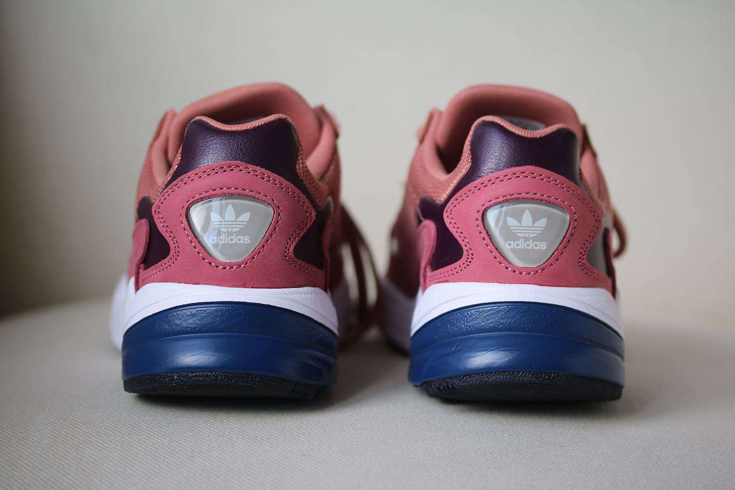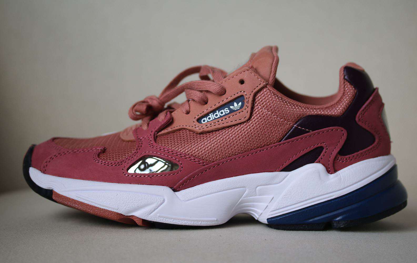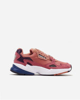 A retro iteration of a running silhouette, these pink 'Falcon' sneakers from adidas Originals are a 90s style that will elevate any trainer edit. The lightweight EVA midsole keeps them comfortable in any setting. Colour: Raw pink/raw pink/dark blue.