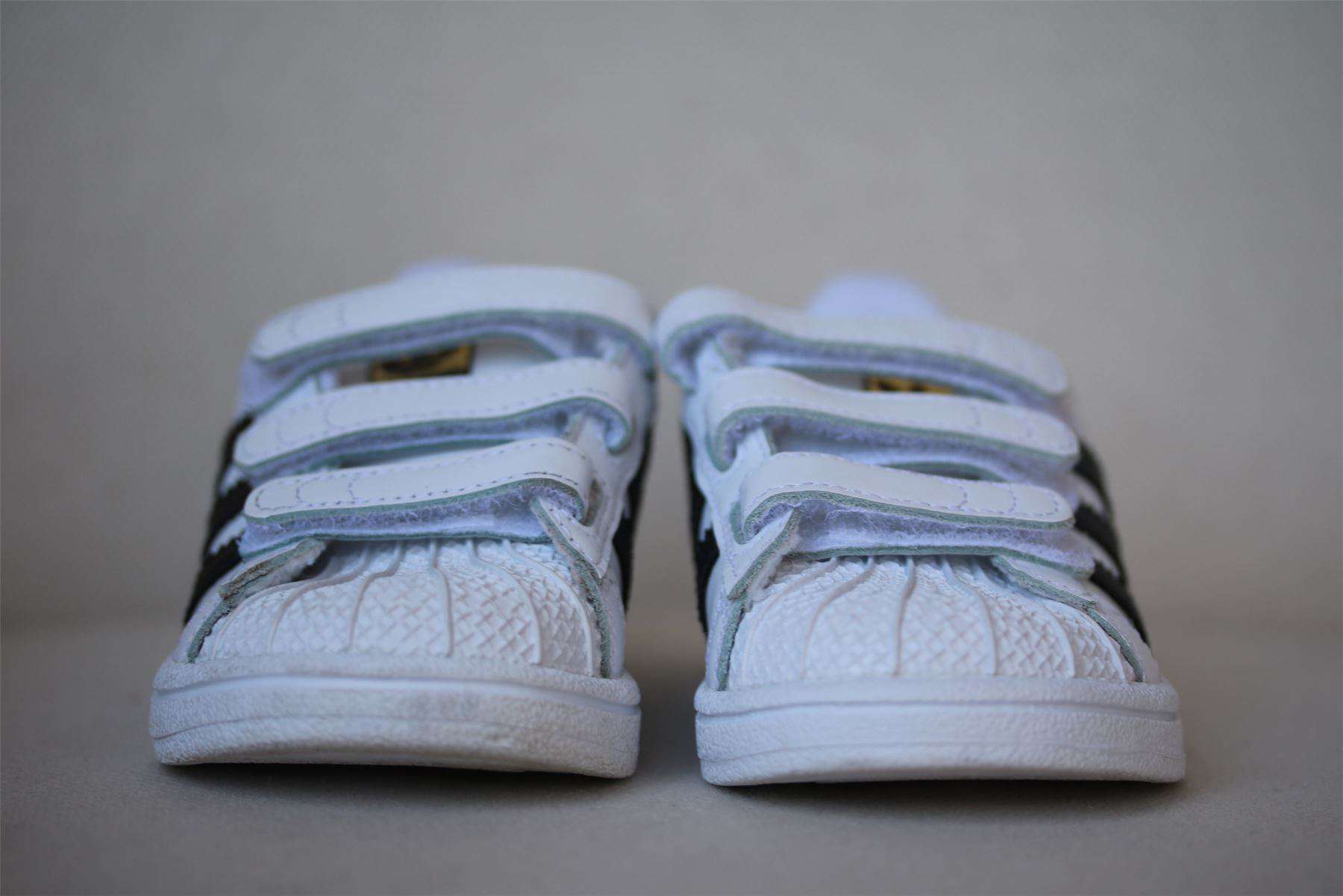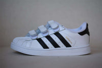From Adidas Originals, these white Superstar Foundation trainers are a brand classic that feature the traditonal three black stripes to the side and a triple velcro strap fastening. Crafted with a leather upper, they also include a cushioned cuff with OrthoLite insoles for optimum comfort and style. Size - EU 25 (UK 7.5, US 8)