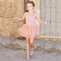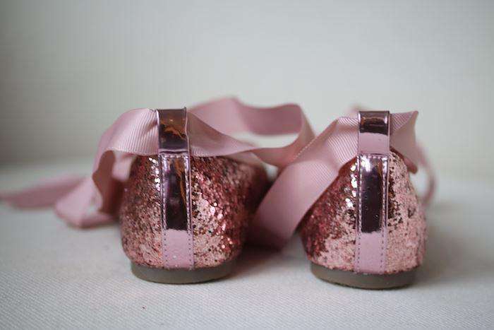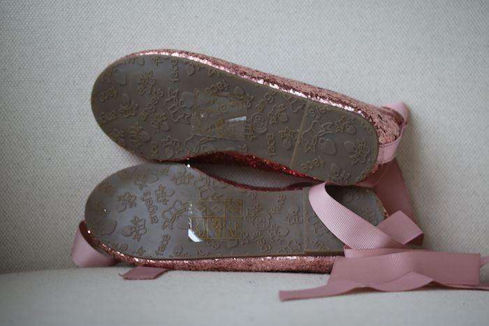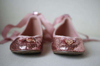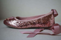 Girls pink glitter ballerina shoes from Angel's Face. The outer shoe and lining are made in fabric, with a faux leather insole and non-slip rubber outer sole. They have a pretty bow and charm on the front, with removable ribbon ties that can be worn around the ankles.