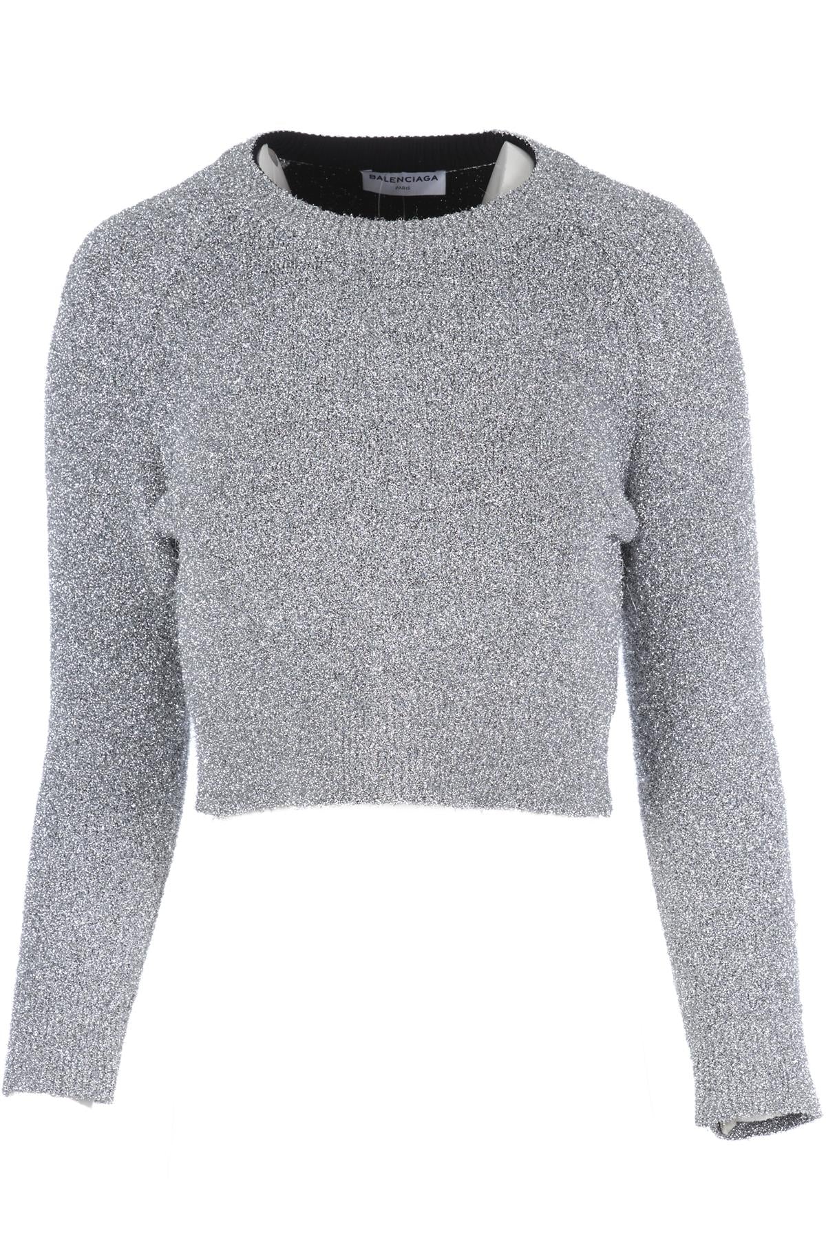 Balenciaga Silver Knit Sweater. Silver. Long Sleeve. Crewneck. Slips on. 60% Viscose, 35% Polyester, 5% Polyamide. FR 34 (UK 6, US 2, IT 38). Bust: 33 in. Waist: 32 in. Hips: 30 in. Length: 18 in.