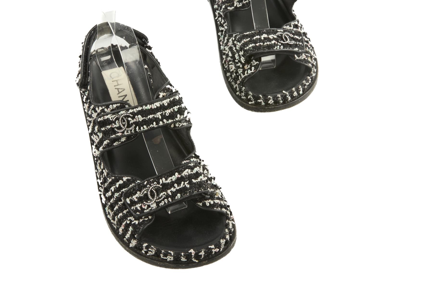Chanel Black 2022 Dad Tweed Sandals. Black and white. Buckle fastening - Side. Does not come with - dustbag or box. EU 38.5 (UK 5.5, US 8.5). Insole: 9.25 in. Heel Height: 0.5 in.