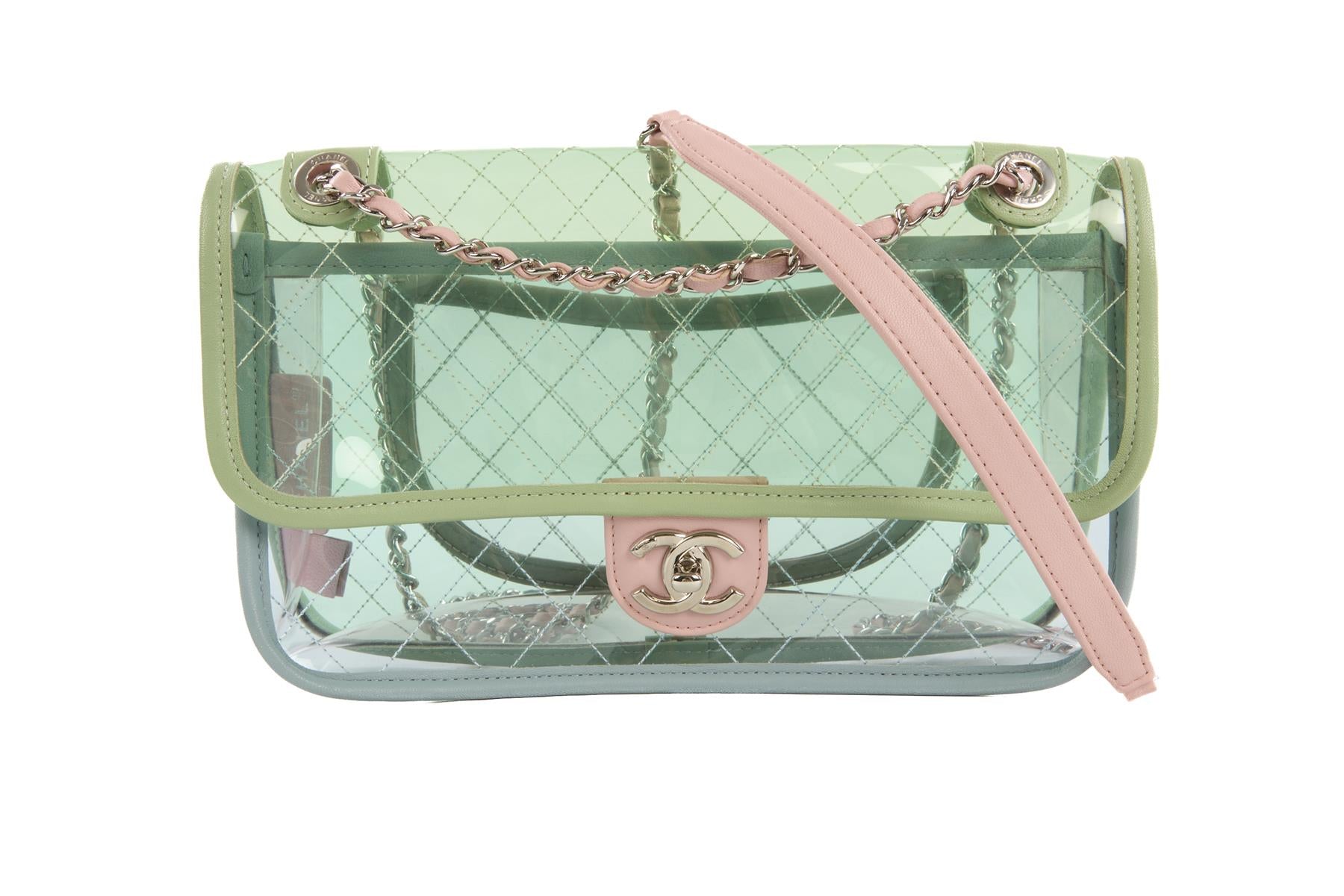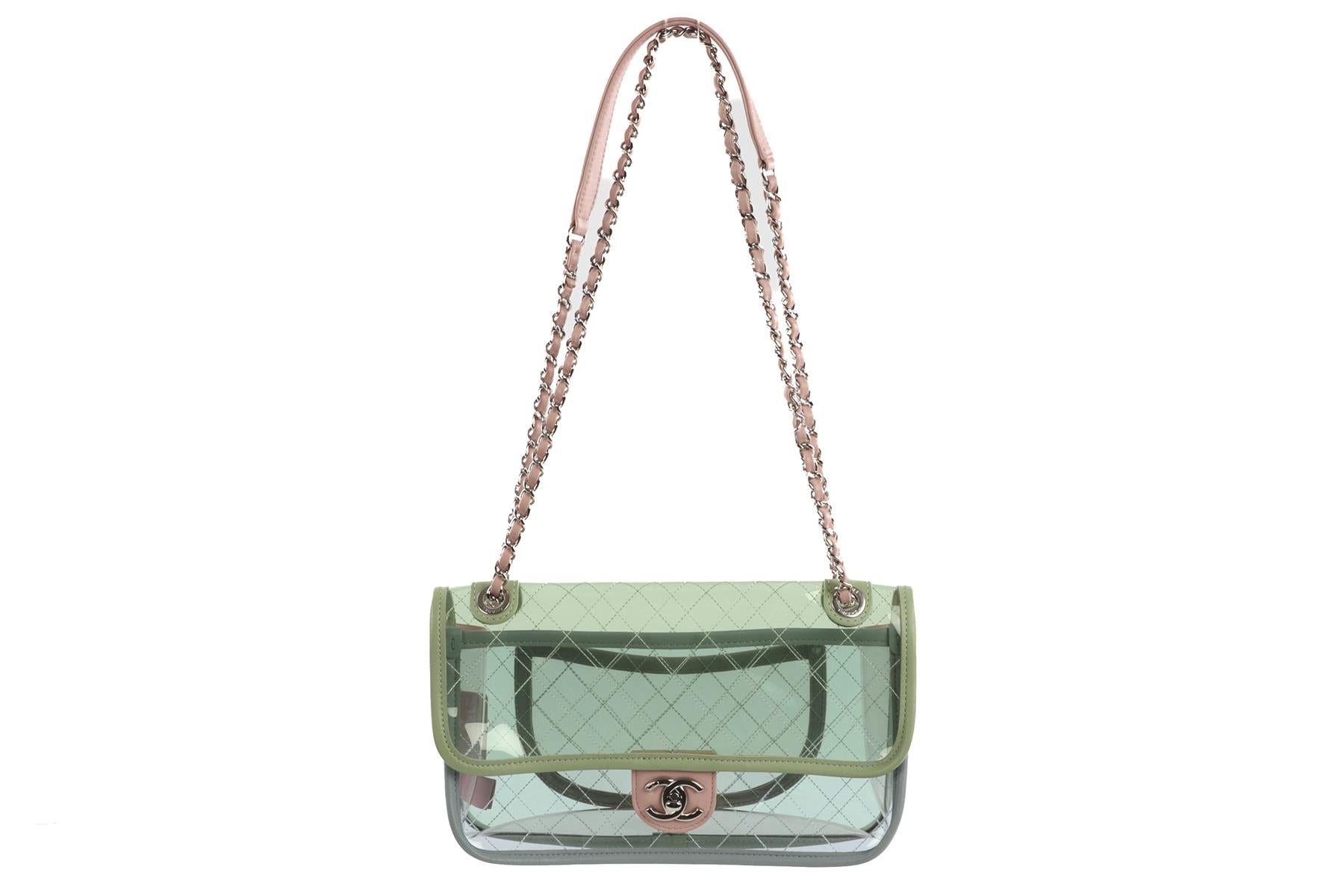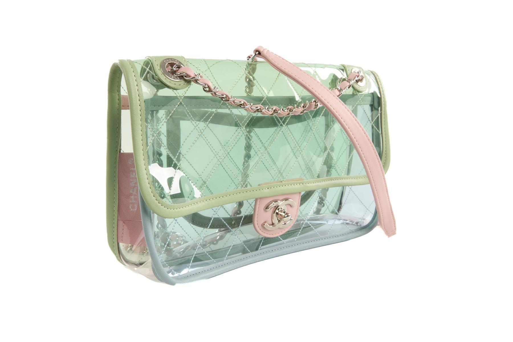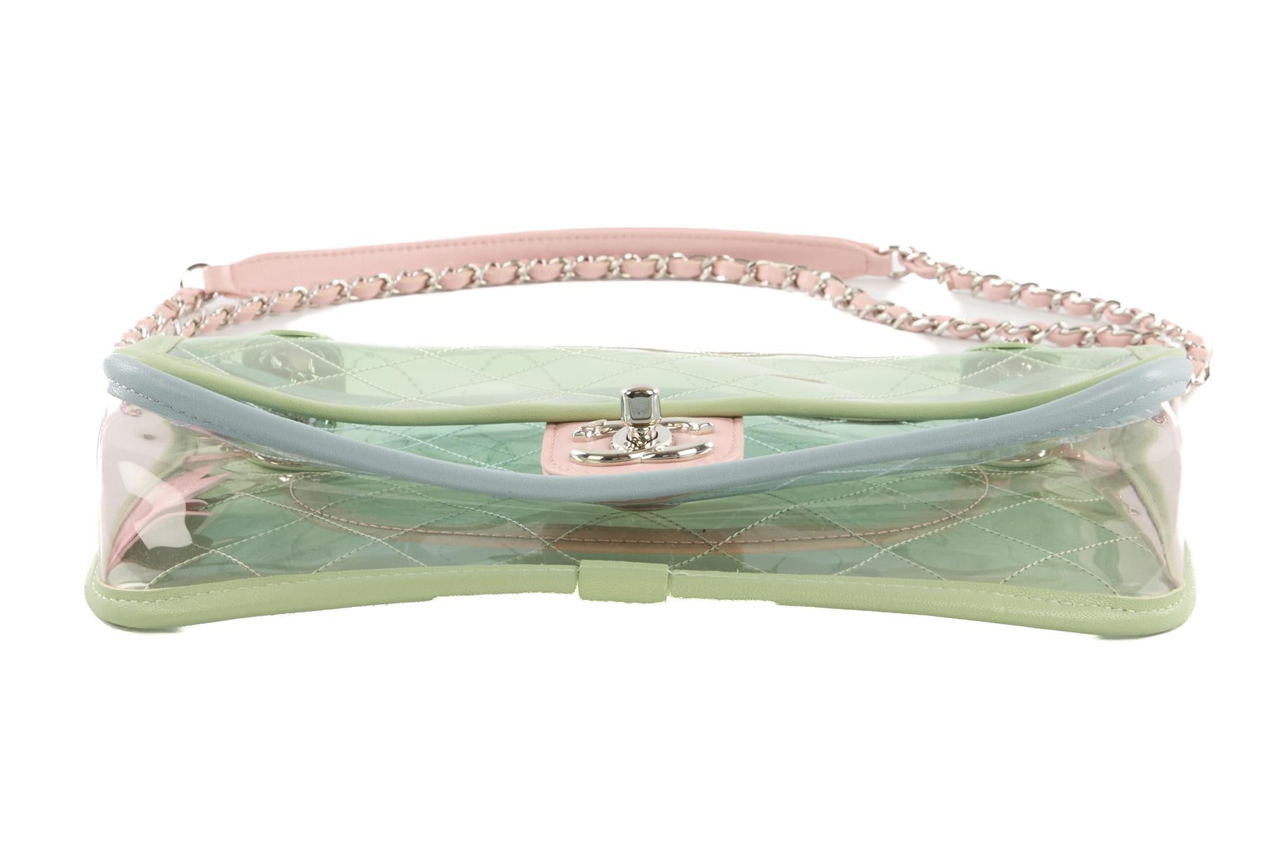 Chanel Green 2018 Coco Splash Flap Pvc Shoulder Bag. Green, pink and blue. Twist lock fastening - Front. Does not come with - dustbag or box. Height: 10 in. Width: 6.5 in. Depth: 2.5 in. Strap drop: 21 in.