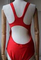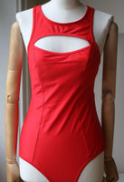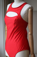 Chromat red microfiber Saldana one-piece racerback swimsuit detailed at front and back with cutouts. Full coverage at bottom. Removable padding. Pulls on. 80% nylon, 20% spandex. Lining: 90% nylon, 10% spandex.