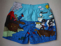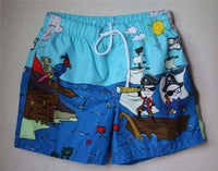 Boys blue swim shorts by Dolce & Gabbana, patterned with the designer's 'Sicilian Pirate' print. Made in smooth polyester, they have an elasticated waistband with a drawstring, a decorative fly and a back pocket, which has the designer's rubberised logo.
