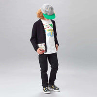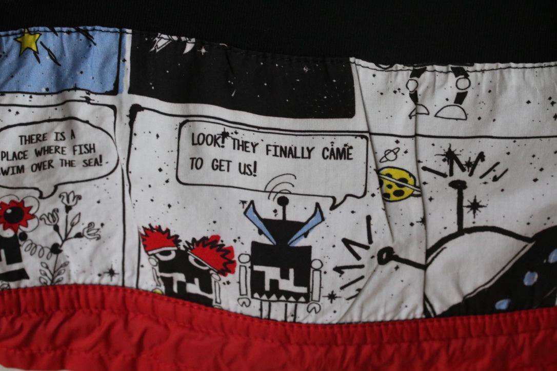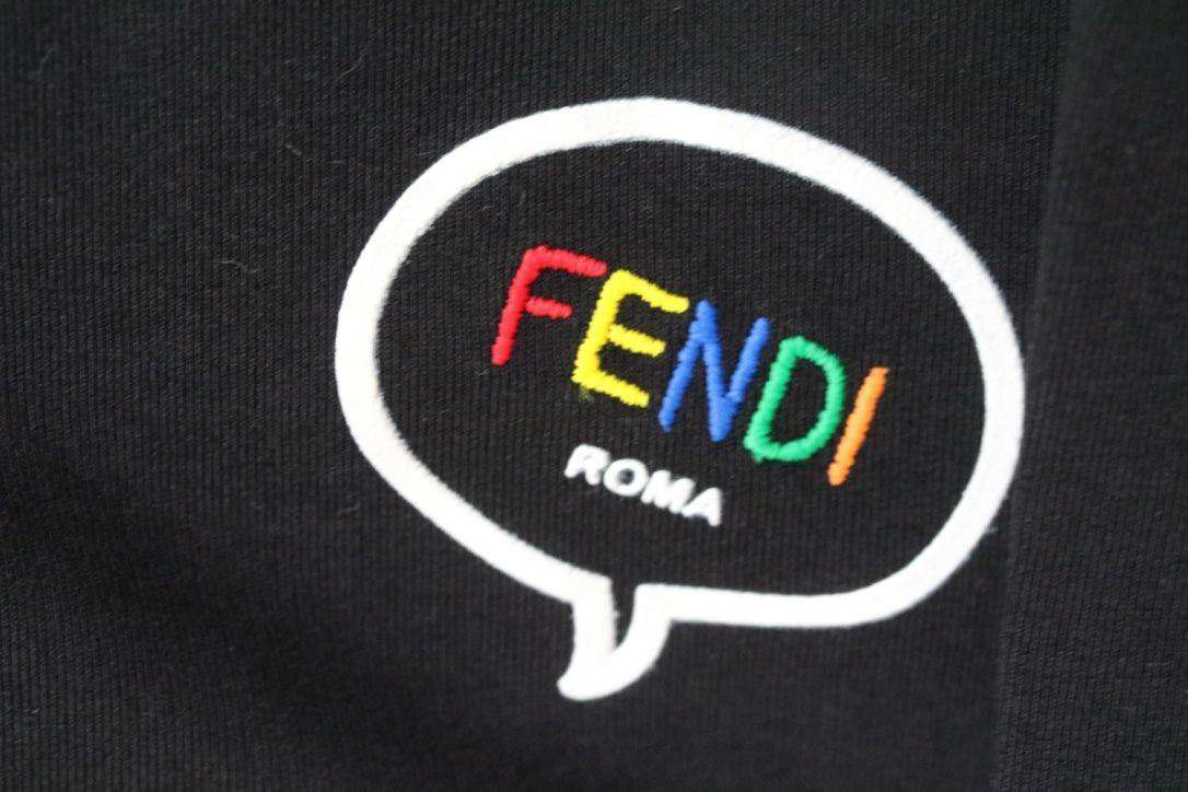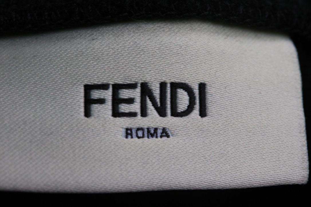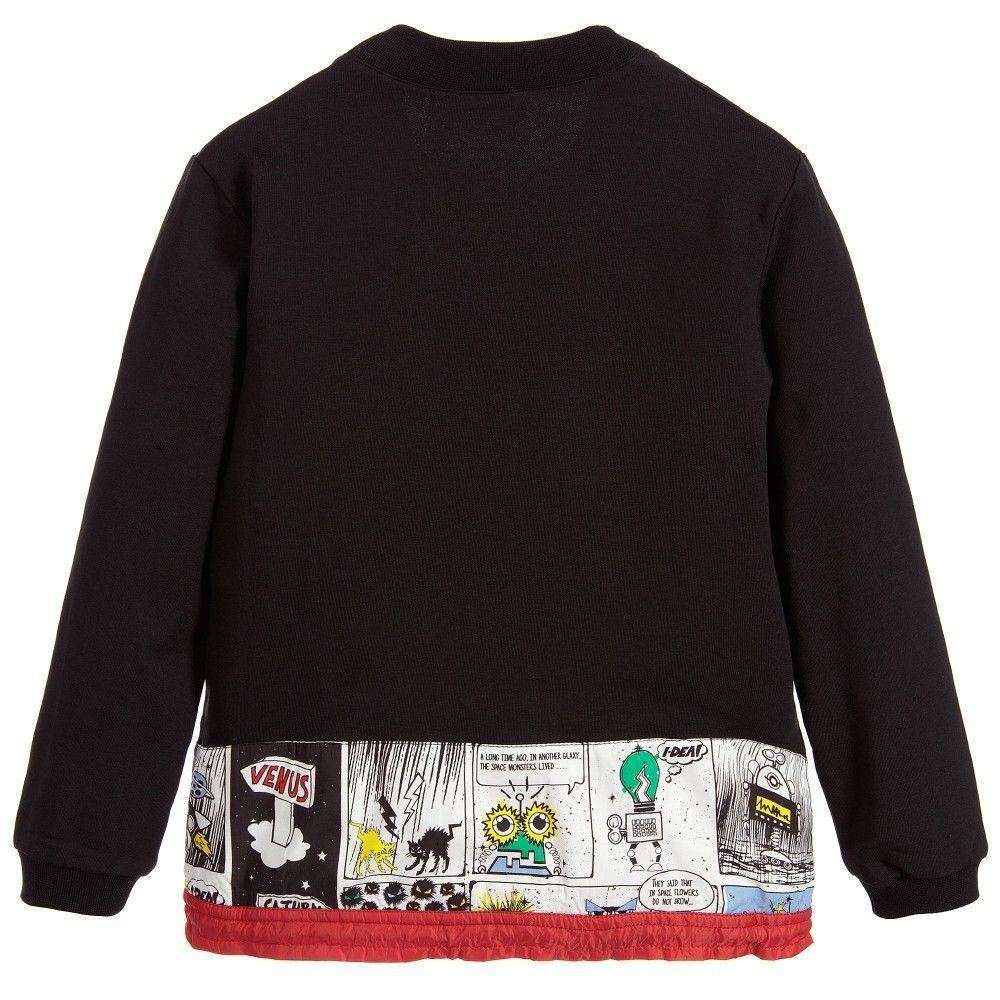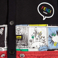 Black cotton cardigan from Fendi. Made in sweatshirt style jersey, the top fastens at the front with buttons and the hemline is embroidered with a monster space cartoon strip, with red edging and toggle adjusters. The designer's logo is embroidered in multi-colours in a speech bubble above.