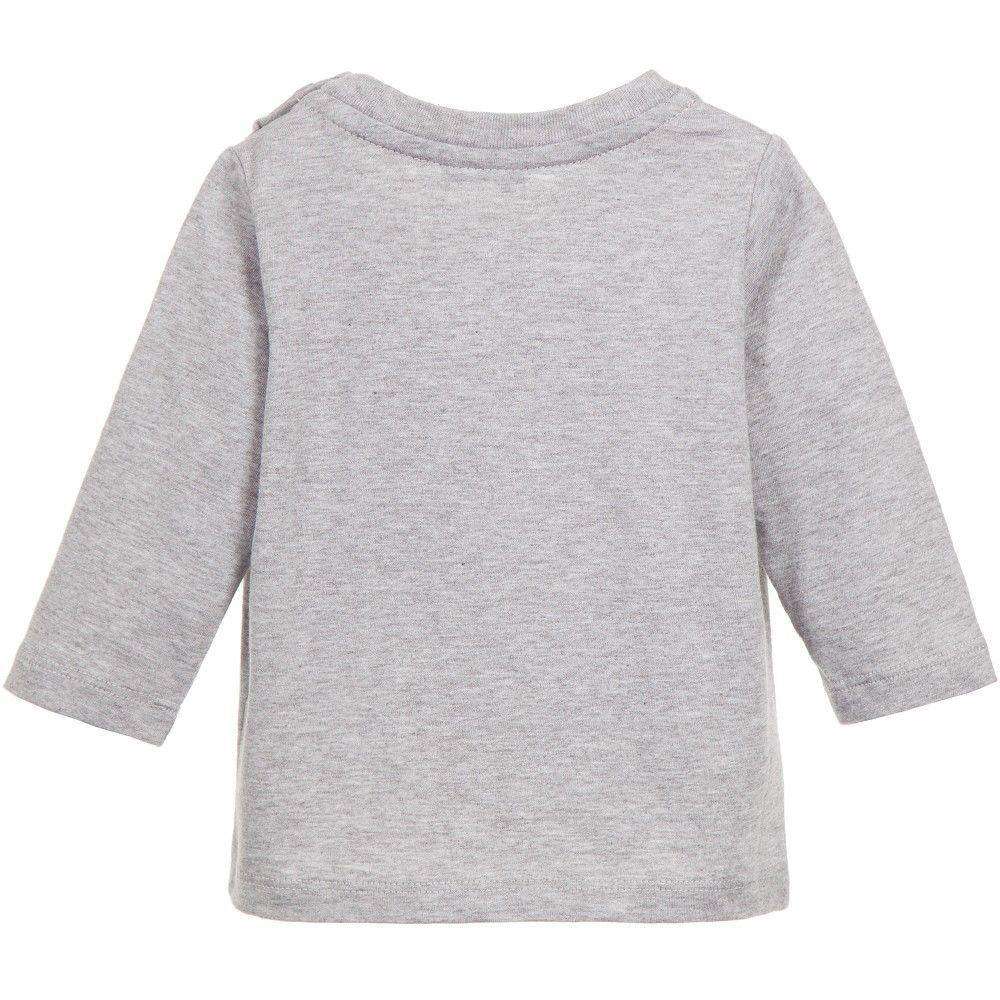 Grey long sleeved t-shirt by Fendi. Made in a soft cotton jersey, it has the designer's signature 'Bag Bug' on a skateboard and logo printed on the front in red and blue. There is a popper fastening on one shoulder to make changing easier..