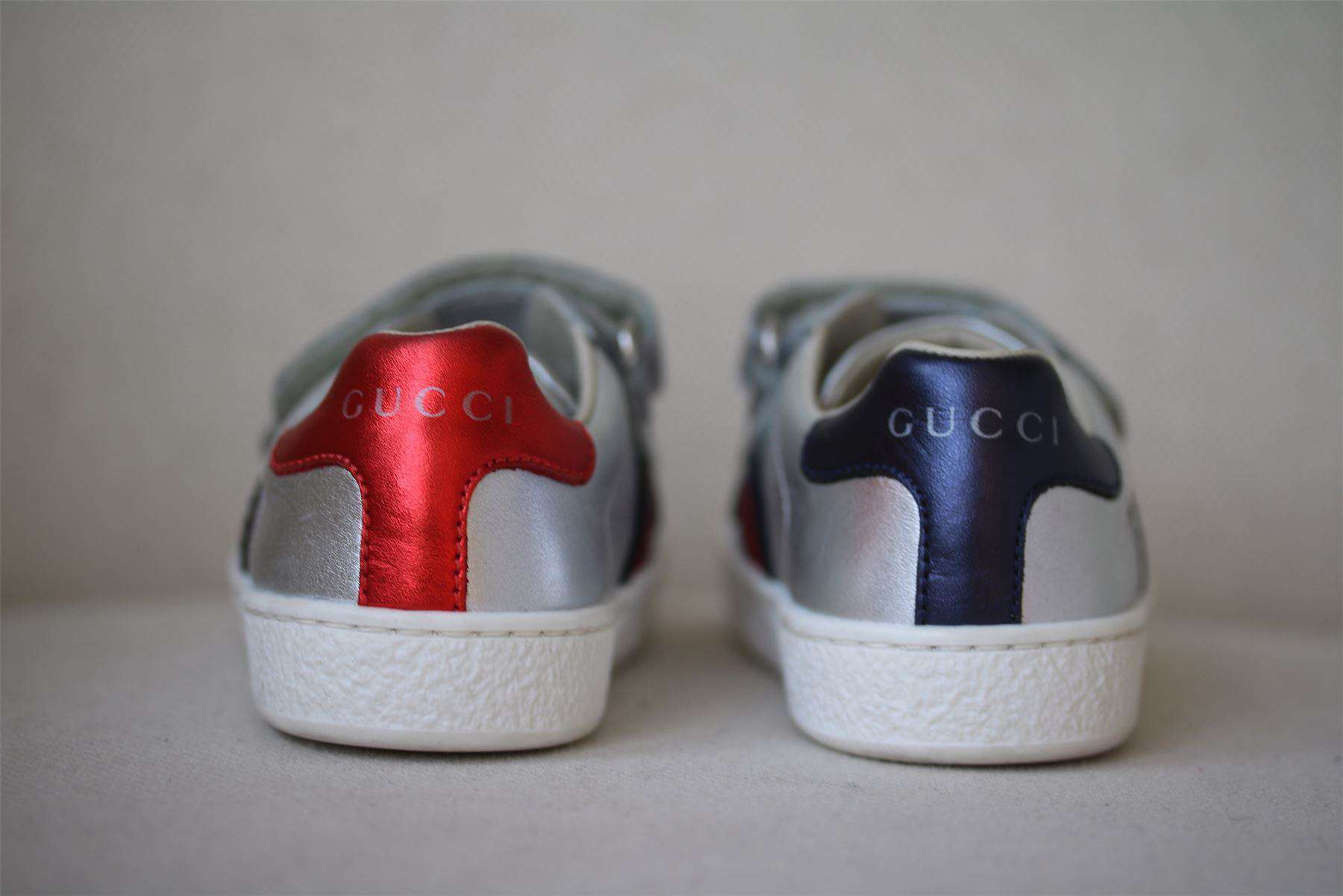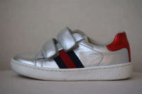 With signature Web stripes and colour clashing metallic backs, these silver Gucci trainers are a luxurious choice for girls and boys. The leather is strong and beautifully soft, and they fasten easily with Velcro straps for on-the-go style. Size - EU 22 (UK 5, US 6)
