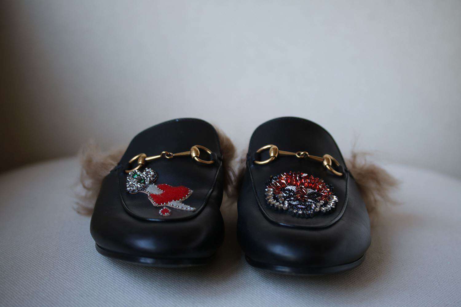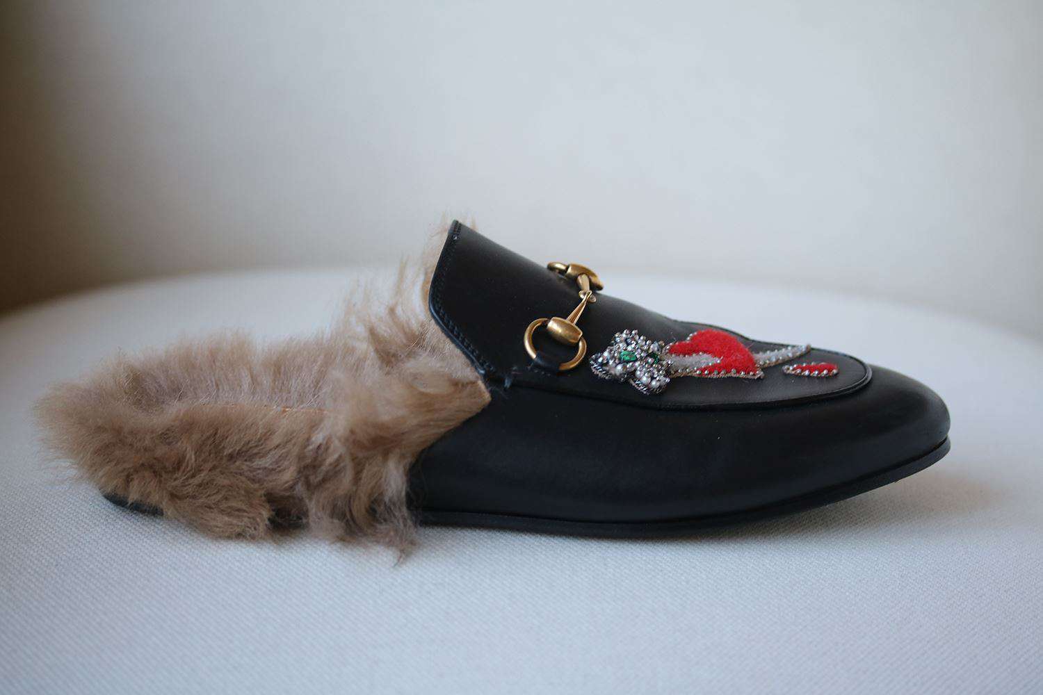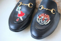 Gucci refreshes its signature 'Princetown' slippers with a set of whimsical appliqués – on the right is a sword-pierced love heart and on the left a crystal-embellished tiger head. Masterfully crafted in Italy from smooth black leather, this pair is topped with signature horsebit plaques and has lightly padded insoles for lasting comfort. Heel measures approximately 10mm/ 0.5 inches. Black leather. Slip on. Made in Italy.