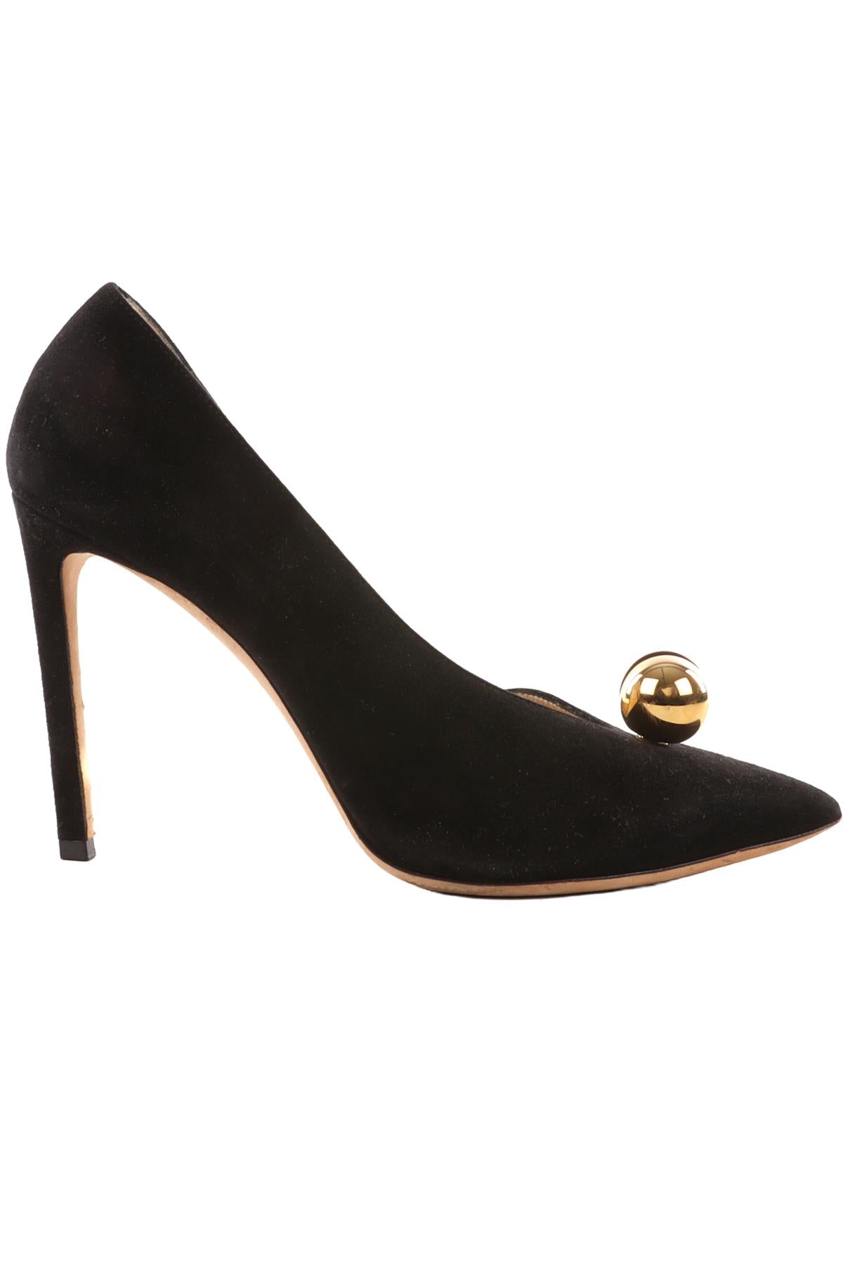 Jimmy Choo Black Suede Pumps. Black and gold. Slips on. Does not come with - dustbag or box. EU 38.5 (UK 5.5, US 8.5). Insole: 9.25 in. Heel Height: 3.5 in.