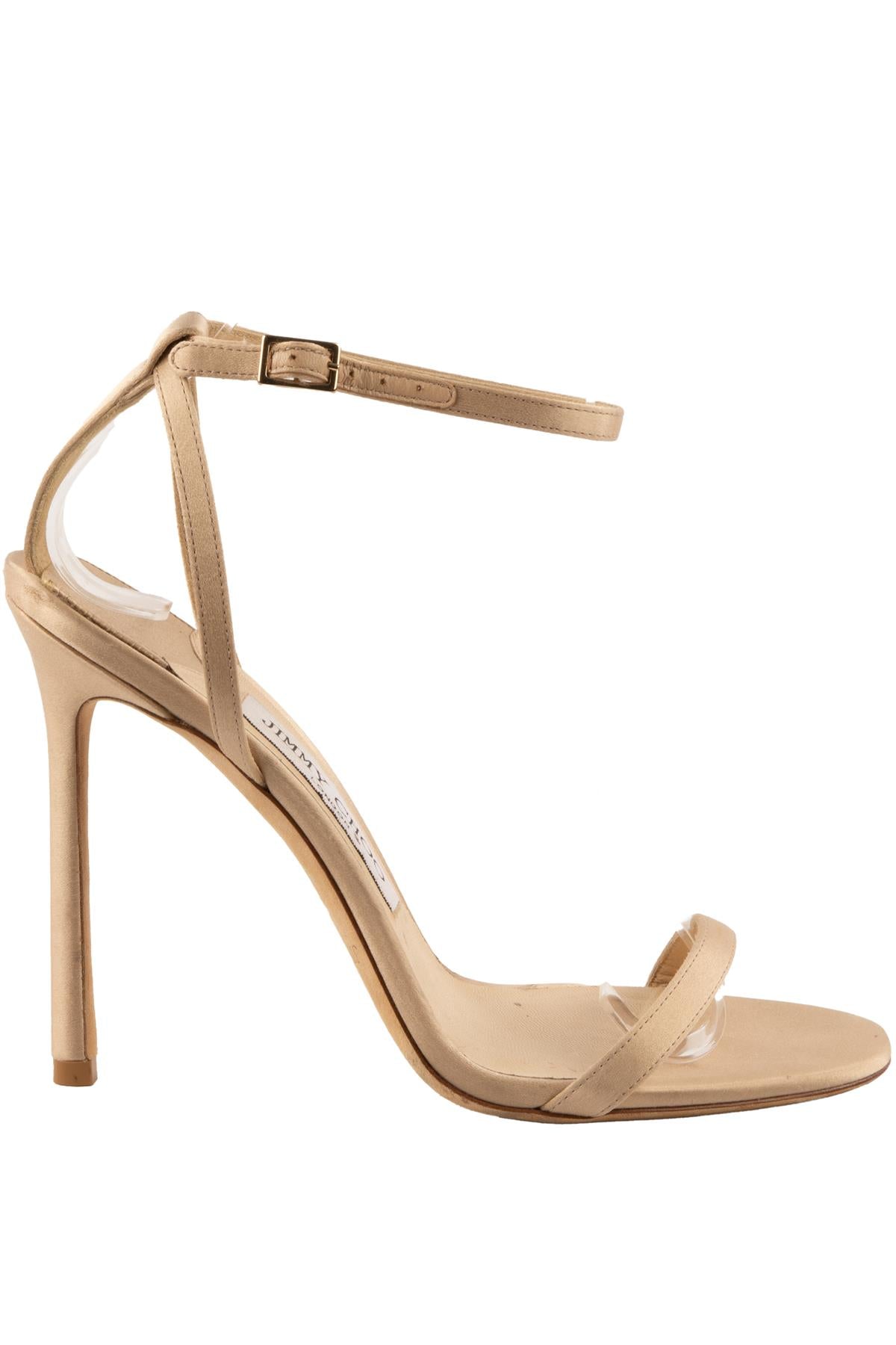 Jimmy Choo Gold Satin Sandals. Gold. Buckle fastening - Side. Does not come with - dustbag or box. EU 38 (UK 5, US 8). Insole: 9.5 in. Heel Height: 4.5 in.