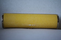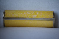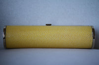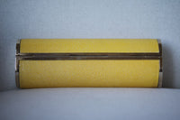- Yellow stingray Jimmy Choo evening clutch with gold-tone hardware, champagne satin lining and push-lock closure at front frame.
