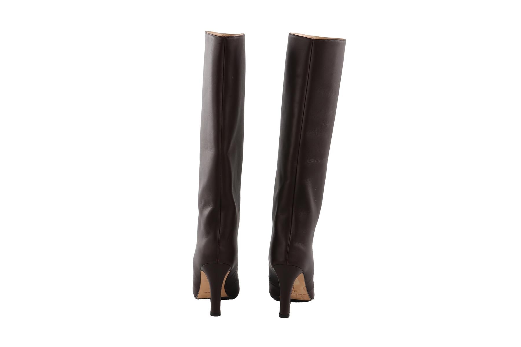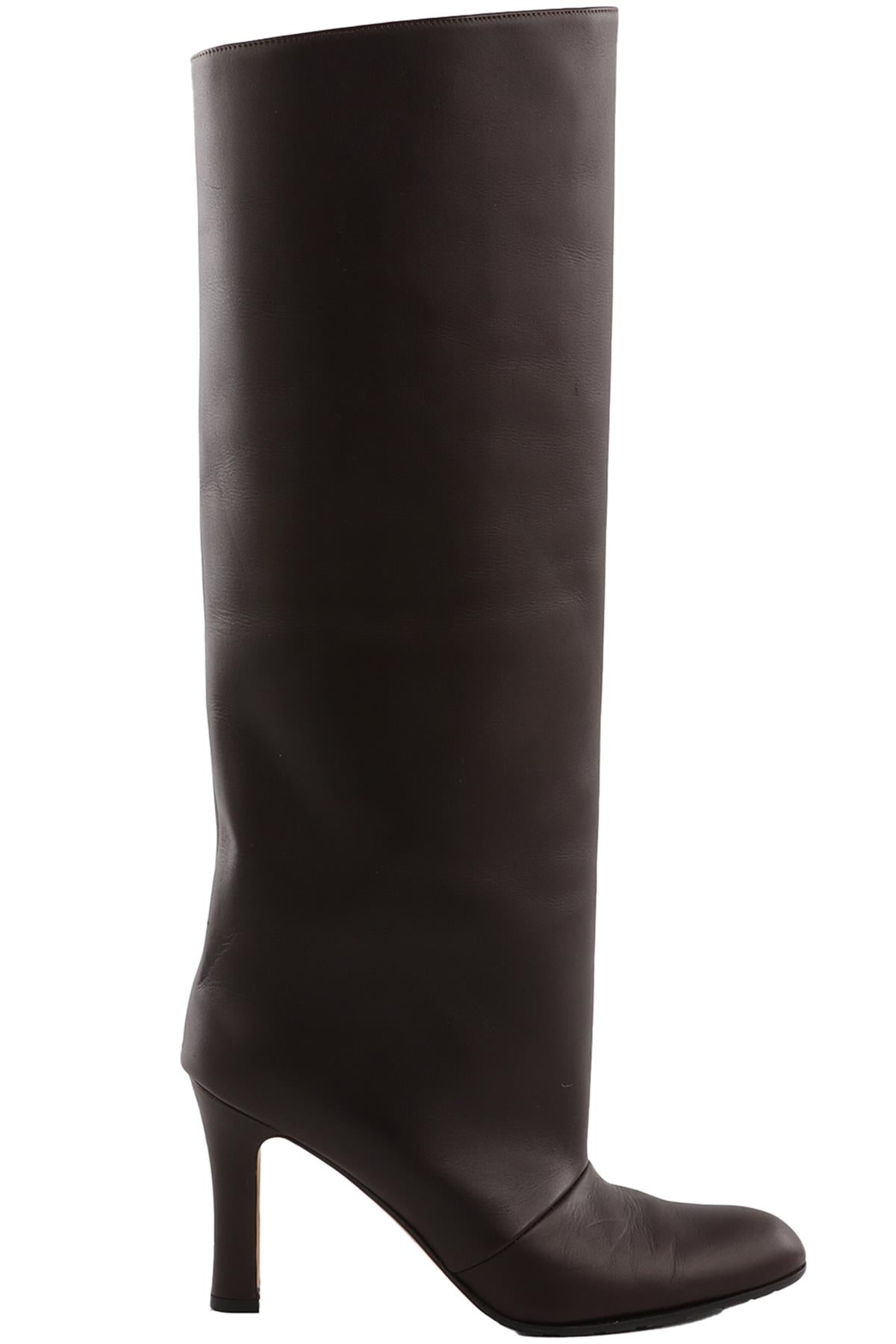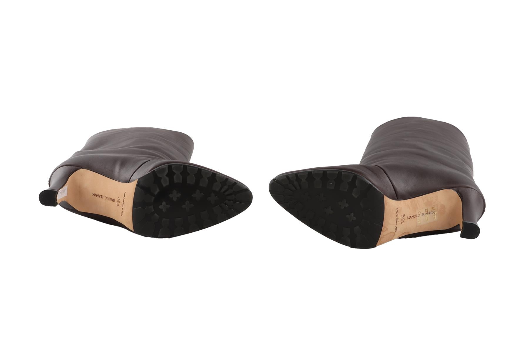 Manolo Blahnik Brown Leather Knee High Boots. Brown. Pull on. Does not come with - dustbag or box. EU 38.5 (UK 5.5, US 8.5). Insole: 10 in. Heel Height: 3.5 in.