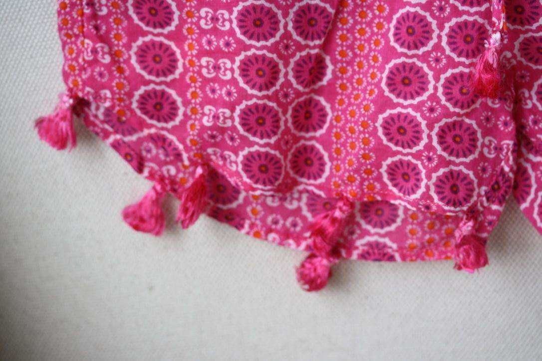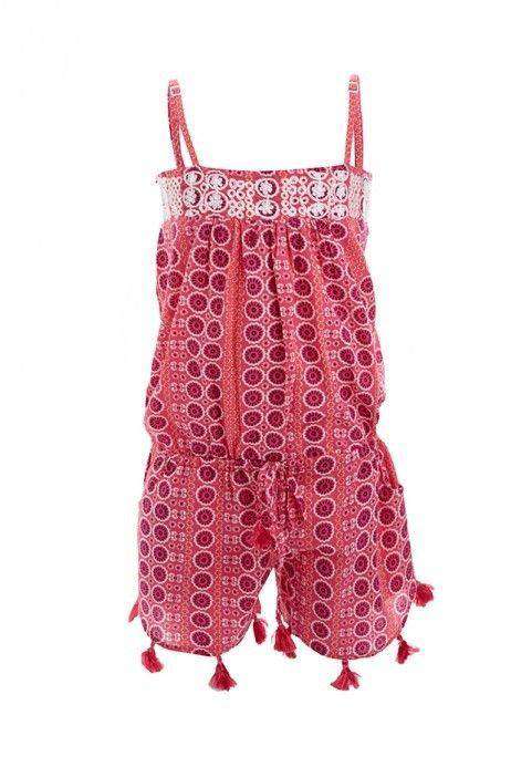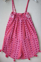 Light cotton playsuit with embroidered trims featuring side pockets, drawstring drop waist, and silk bohemian tassels along the bottom.