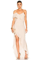 Self & Lining: 100% silk. Fully lined. Ruffled detail. Back tie closure. Front slit. Asymmetrical hem.