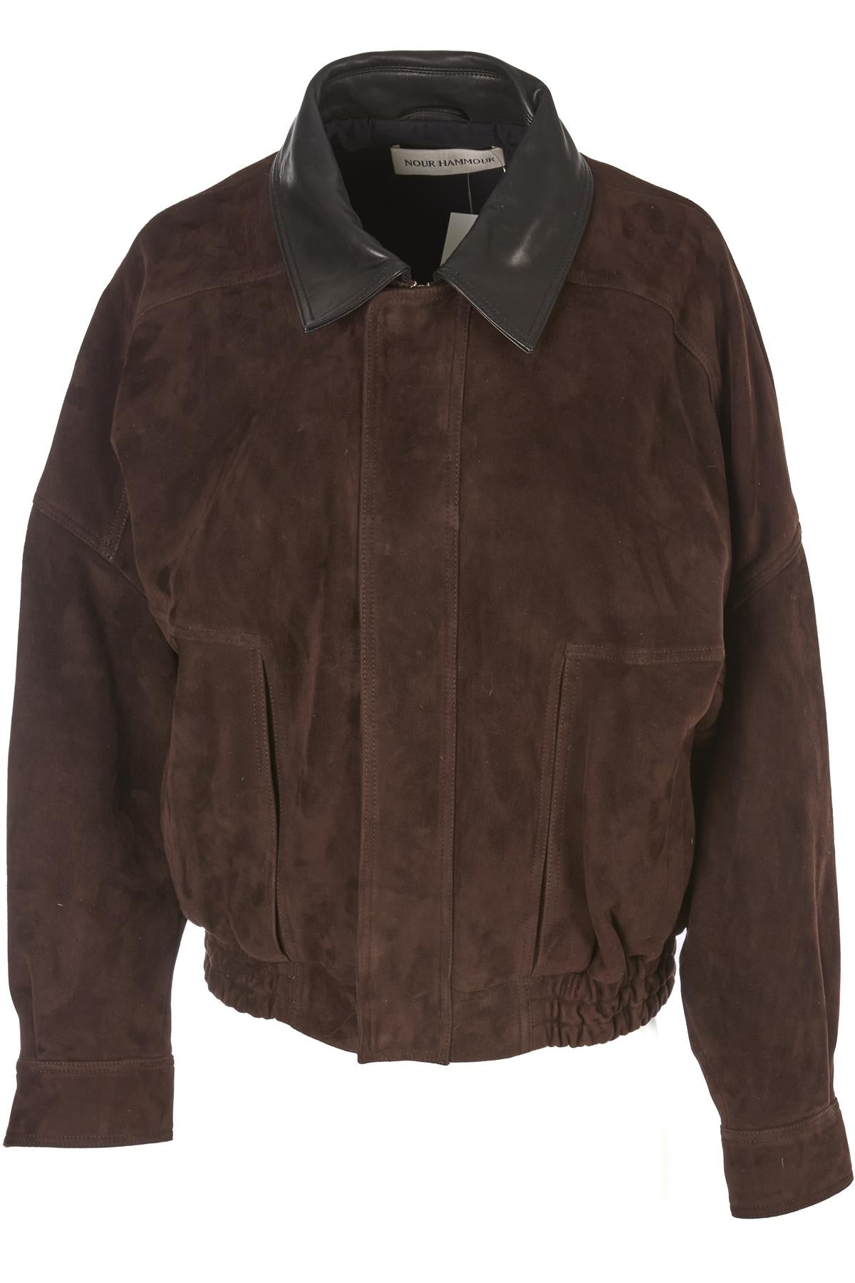 Nour Hammour Brown Suede Jacket. Brown. Long Sleeve. Crewneck. Zip fastening - Front. 100% Goat suede, 63% Cupro, 37% Viscose, 100% Silk. Medium (UK 10, US 6, FR 38, IT 42). Shoulder to Shoulder: 19.5 in. Bust: 50 in. Waist: 39 in. Hips: 35 in. Length: 25 in.