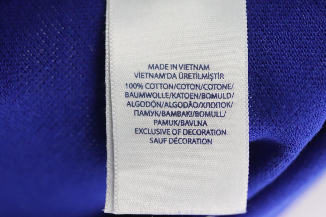 - Made from bright-blue cotton-pique with pink embroidered horse.
