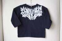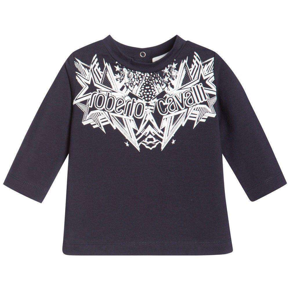 Roberto Cavalli long sleeved navy top, made in a soft cotton jersey. It has an abstract pattern and the designer's name printed in white across the front and popper fastenings on the back to help with dressing.