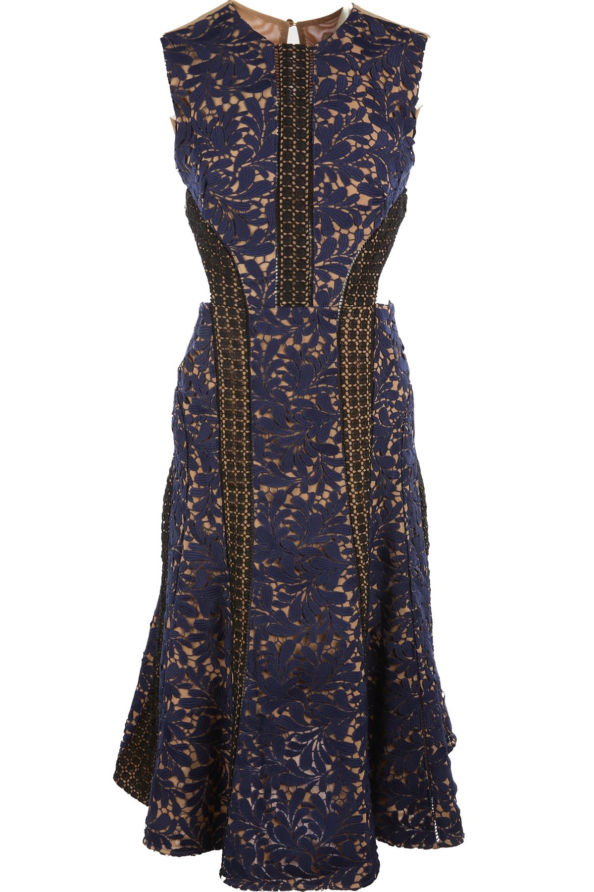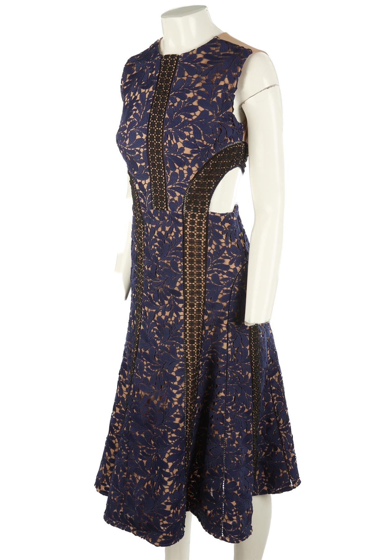 Self-Portrait Navy Crochet Midi Dress. Navy. Sleeveless. Crewneck. Zip fastening - Back. 94% Polyester, 6% Spandex, 90% Polyester, 10% Spandex. UK 10 (US 6, FR 38, IT 42). Bust: 32 in. Waist: 28 in. Hips: 36 in. Length: 43 in.