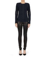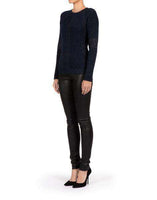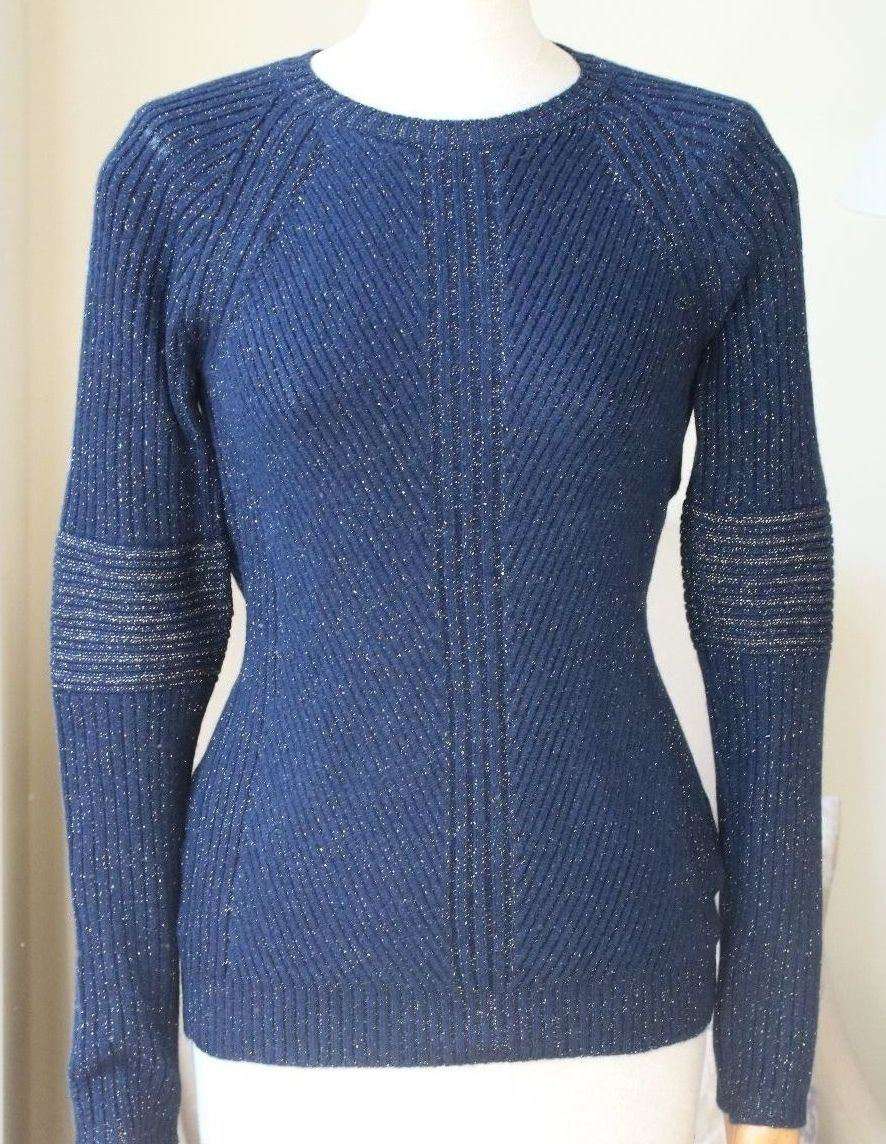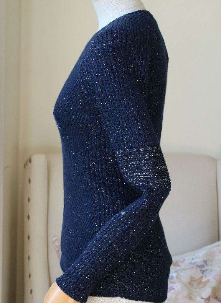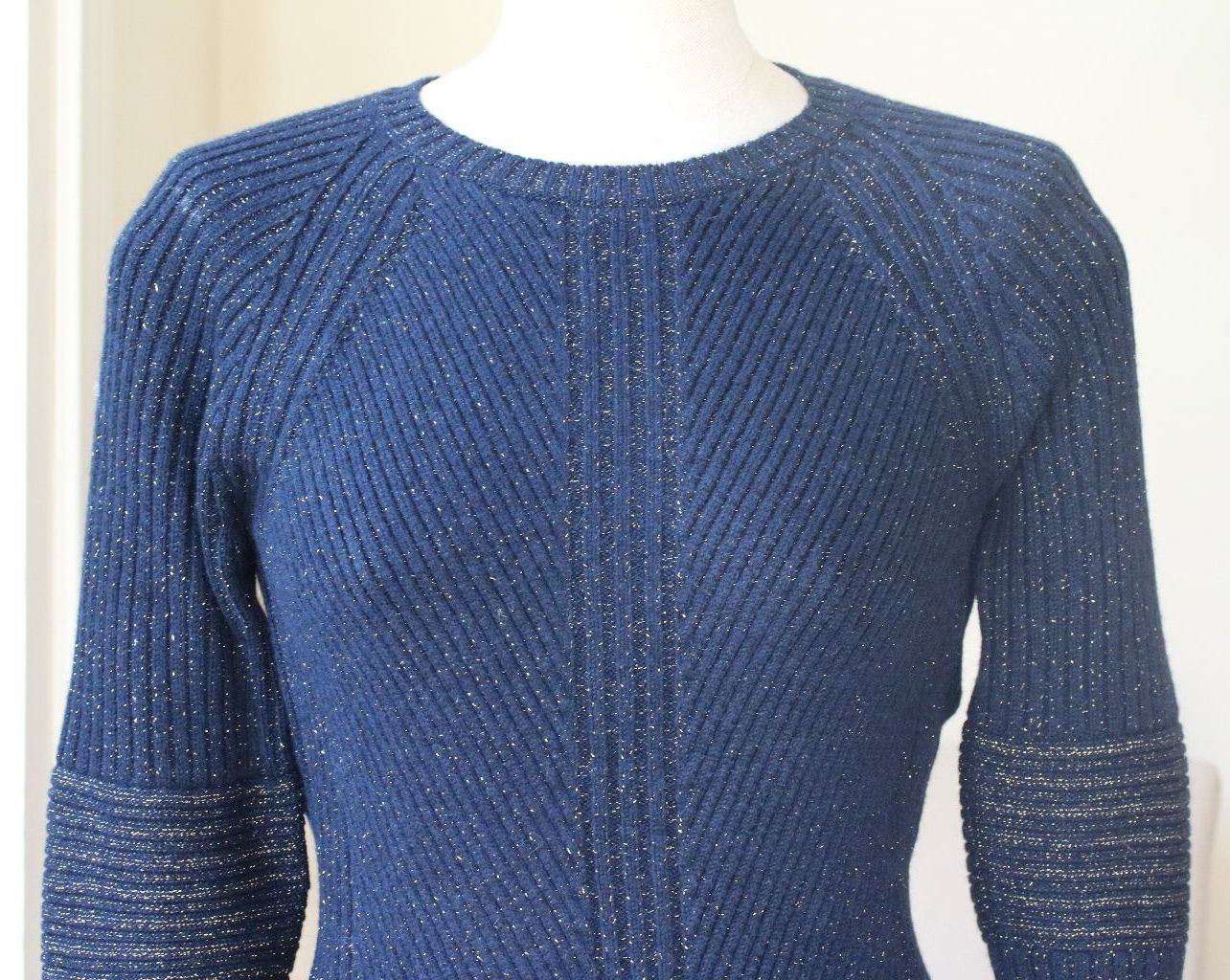 Siran Sweater . The Siran sweater is knitted with the finest Italian navy cashmere mixed with gold lurex for a luxurious look and soft hand touch. Crafted texture with body form engineered rib detailing on the body and sleeves. 100% Cashmere. Size - UK 8, US 4, IT 40, FR 36 RRP: £850 Ref: SSW10