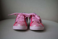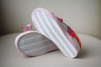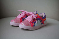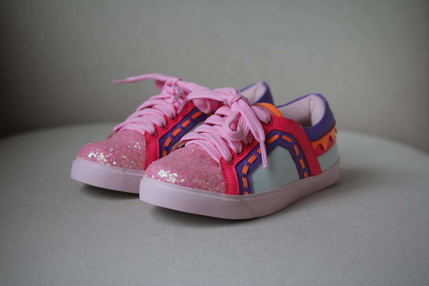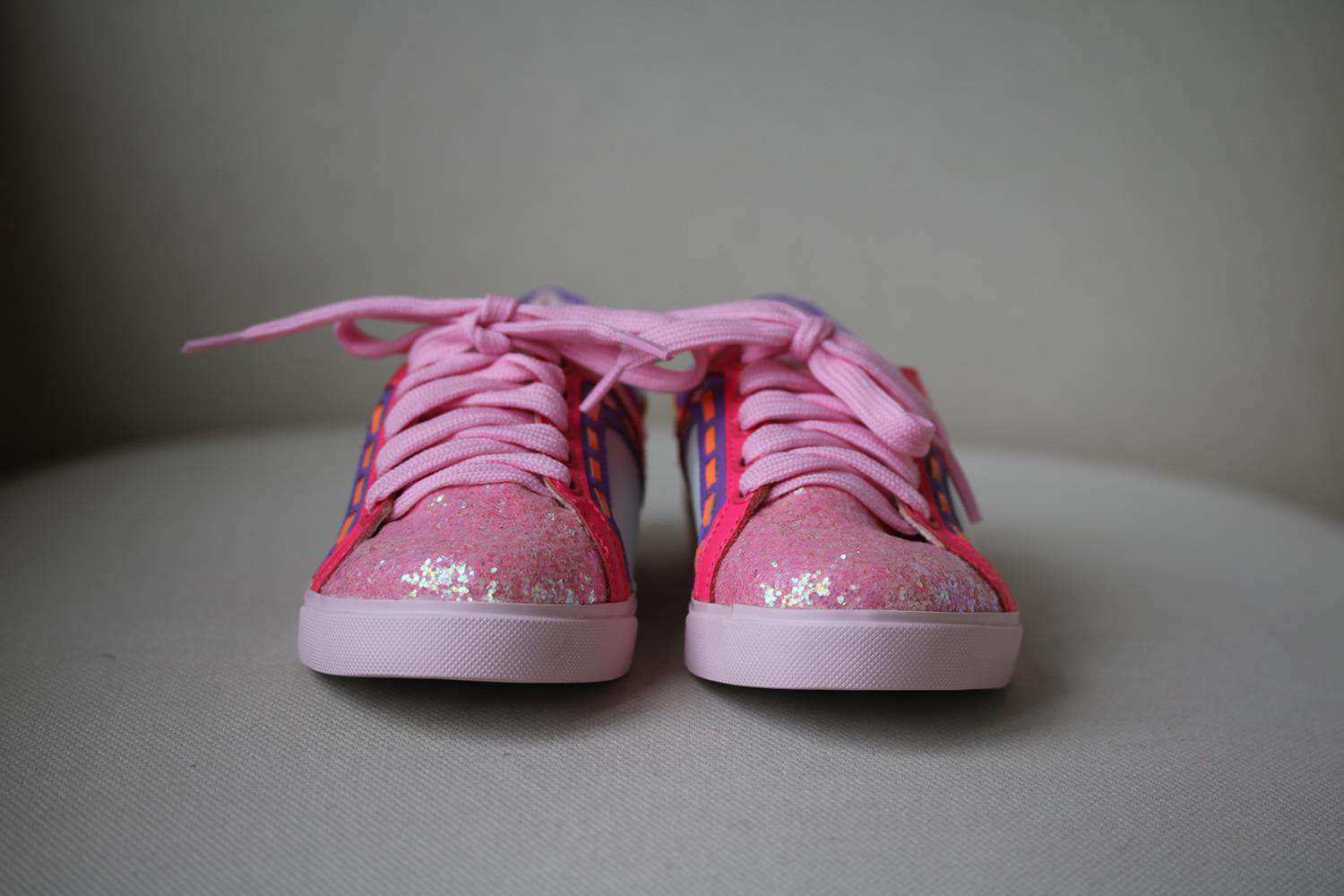 - The outer shoe is made in soft leather, with pink glitter toes and neon trims.