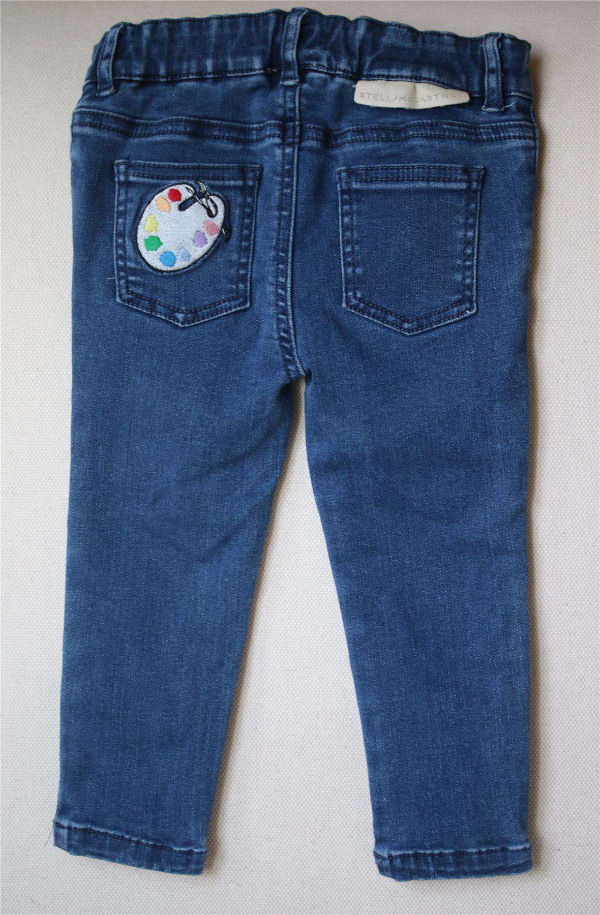 Stella McCartney Kids blue denim stretchy jeans with popper and zip fastening and an adorable paint palette patch on the back.