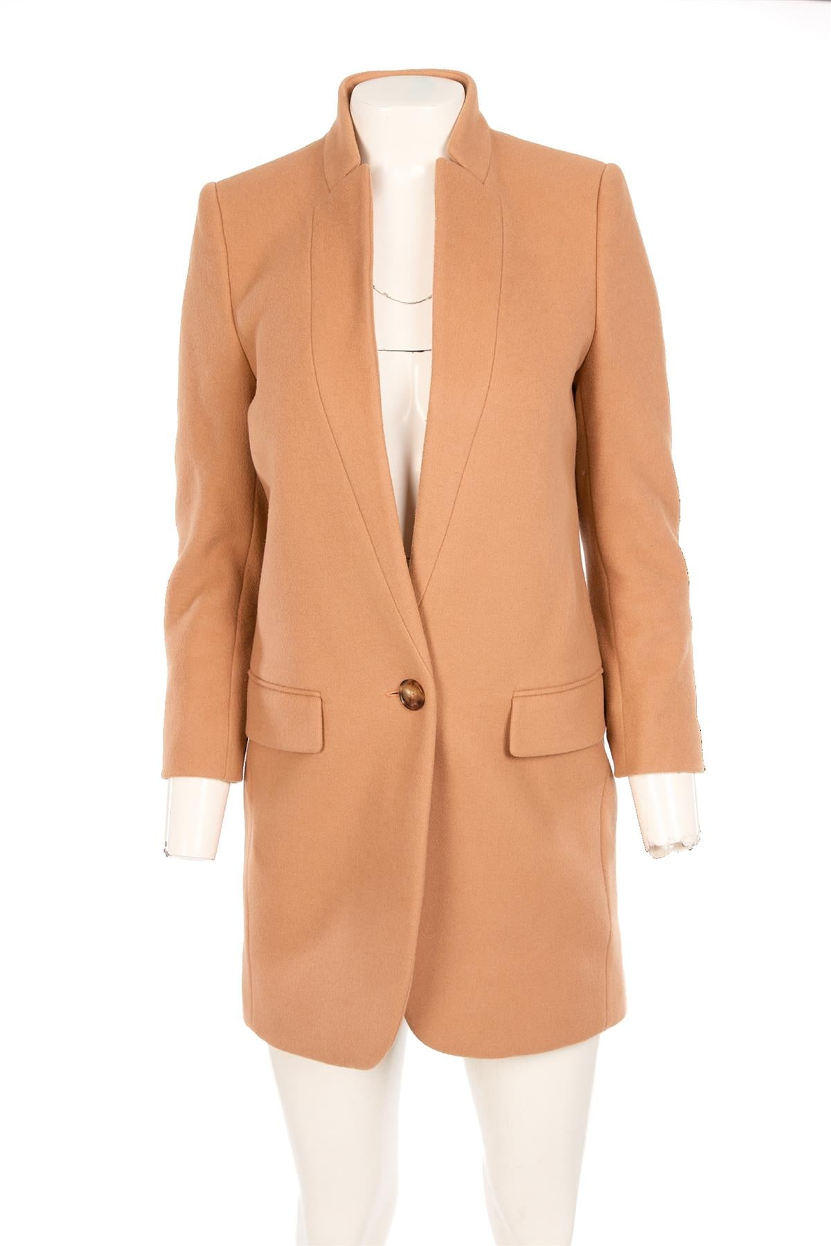 Stella Mccartney Tan Wool Coat. Tan. Long Sleeve. V-Neck. Button fastening - Front. 75% Wool, 25% Polyamide. IT 40 (UK 8, US 4, FR 36). Shoulder to Shoulder: 15 in. Bust: 38 in. Waist: 36 in. Hips: 39 in. Length: 34.5 in.