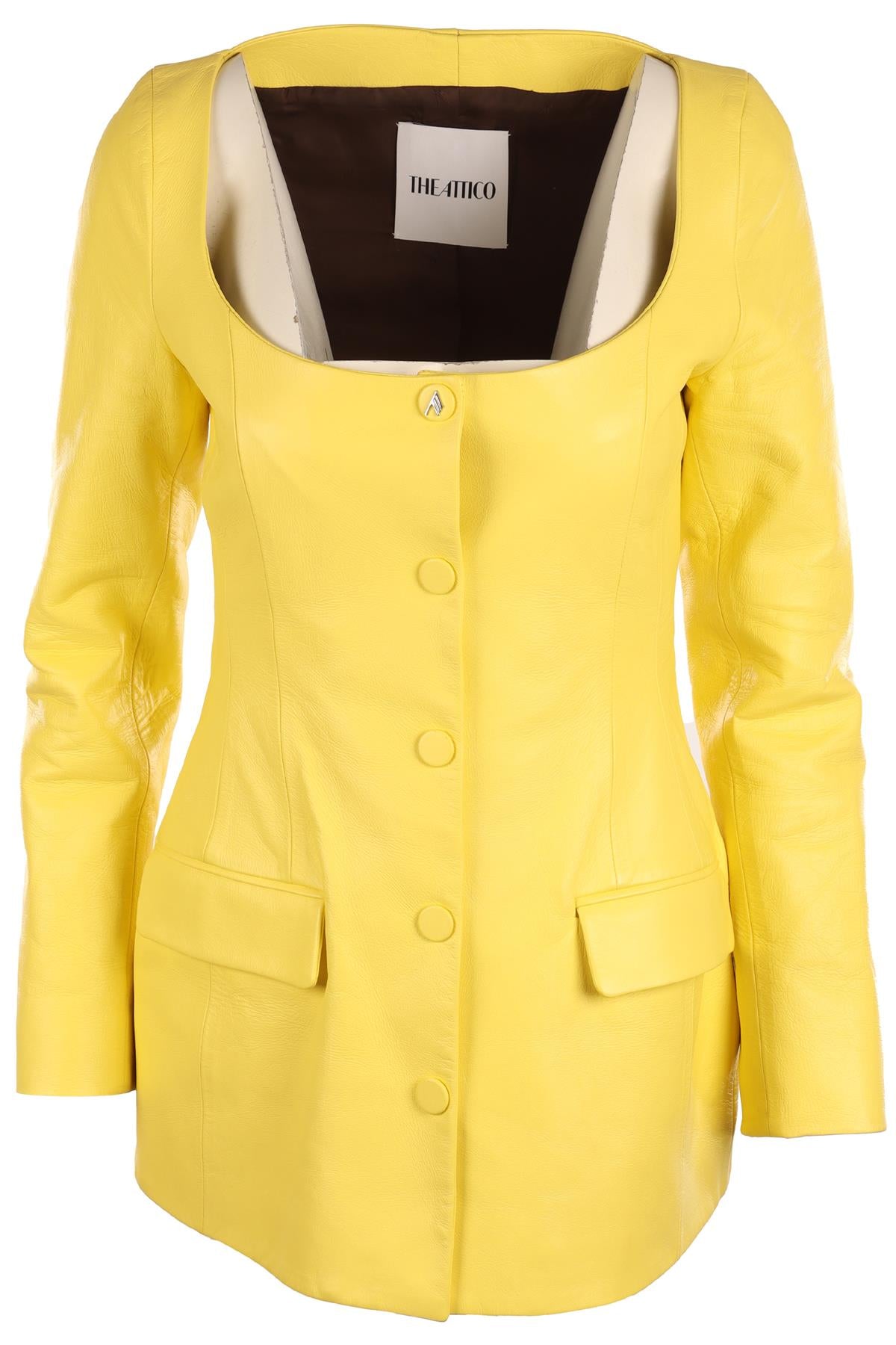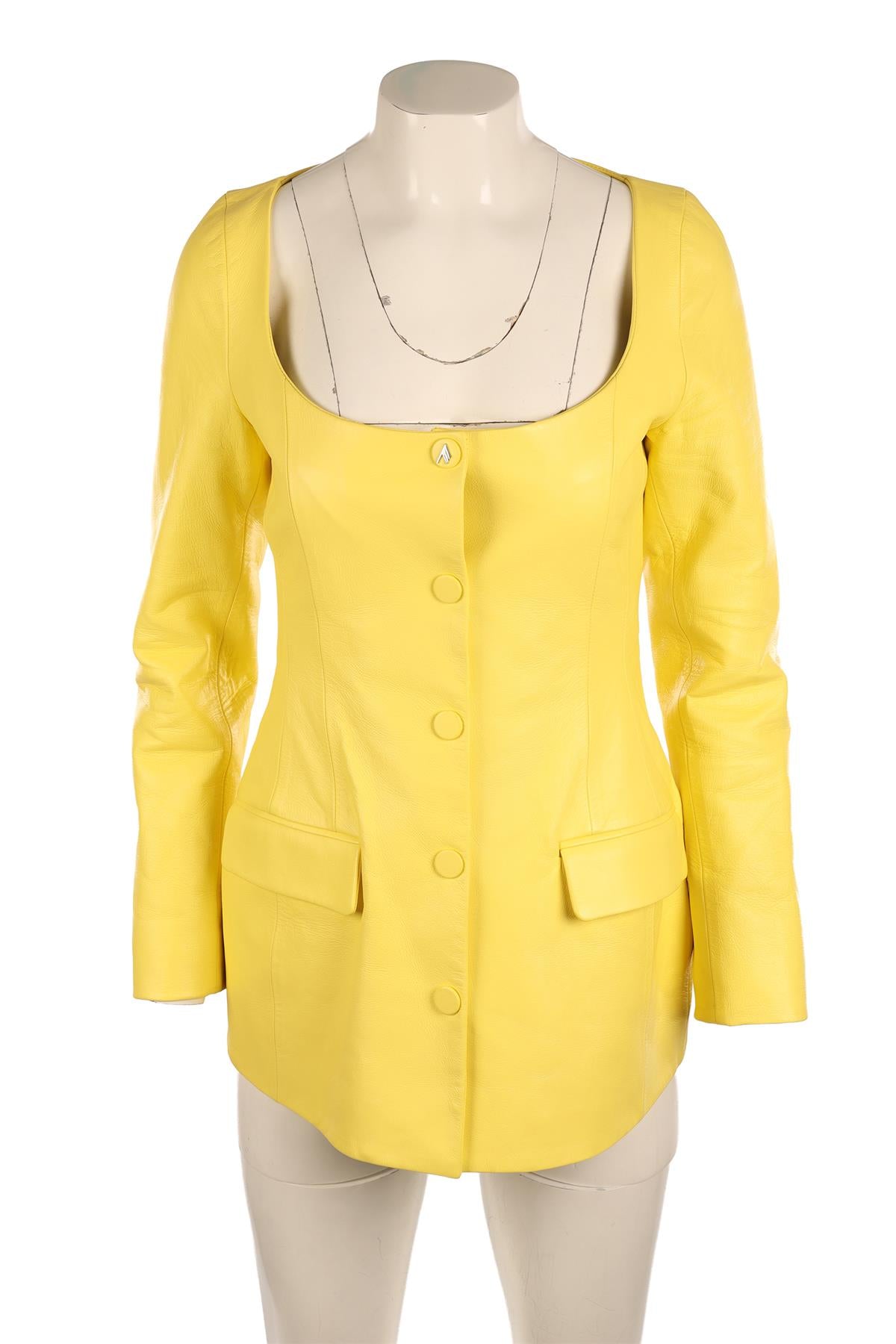 The Attico Yellow Leather Blazer. Yellow. Long Sleeve. Square Neck. Snap button fastening - Front. 100% Lamb leather, 100% Cupro. IT 42 (UK 10, US 6, FR 38). Bust: 32 in. Waist: 28 in. Hips: 38 in. Length: 27 in.