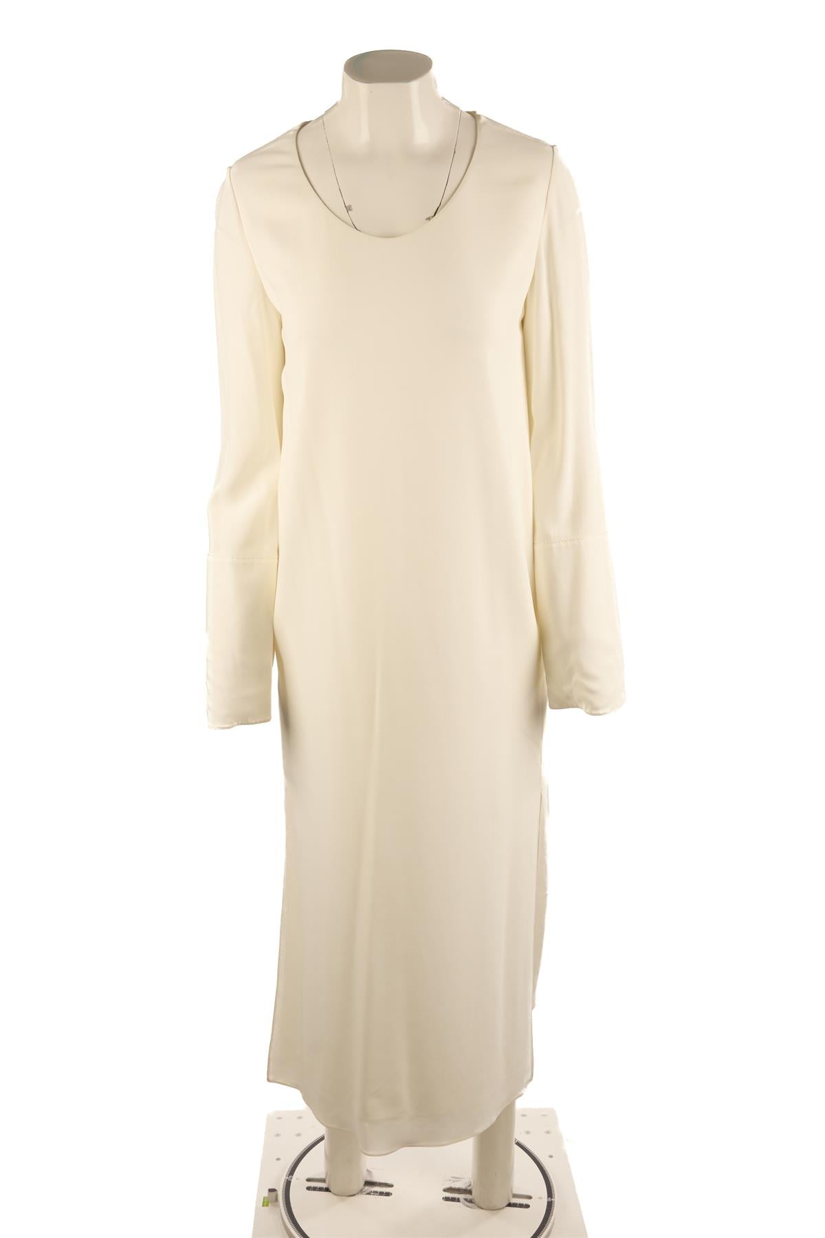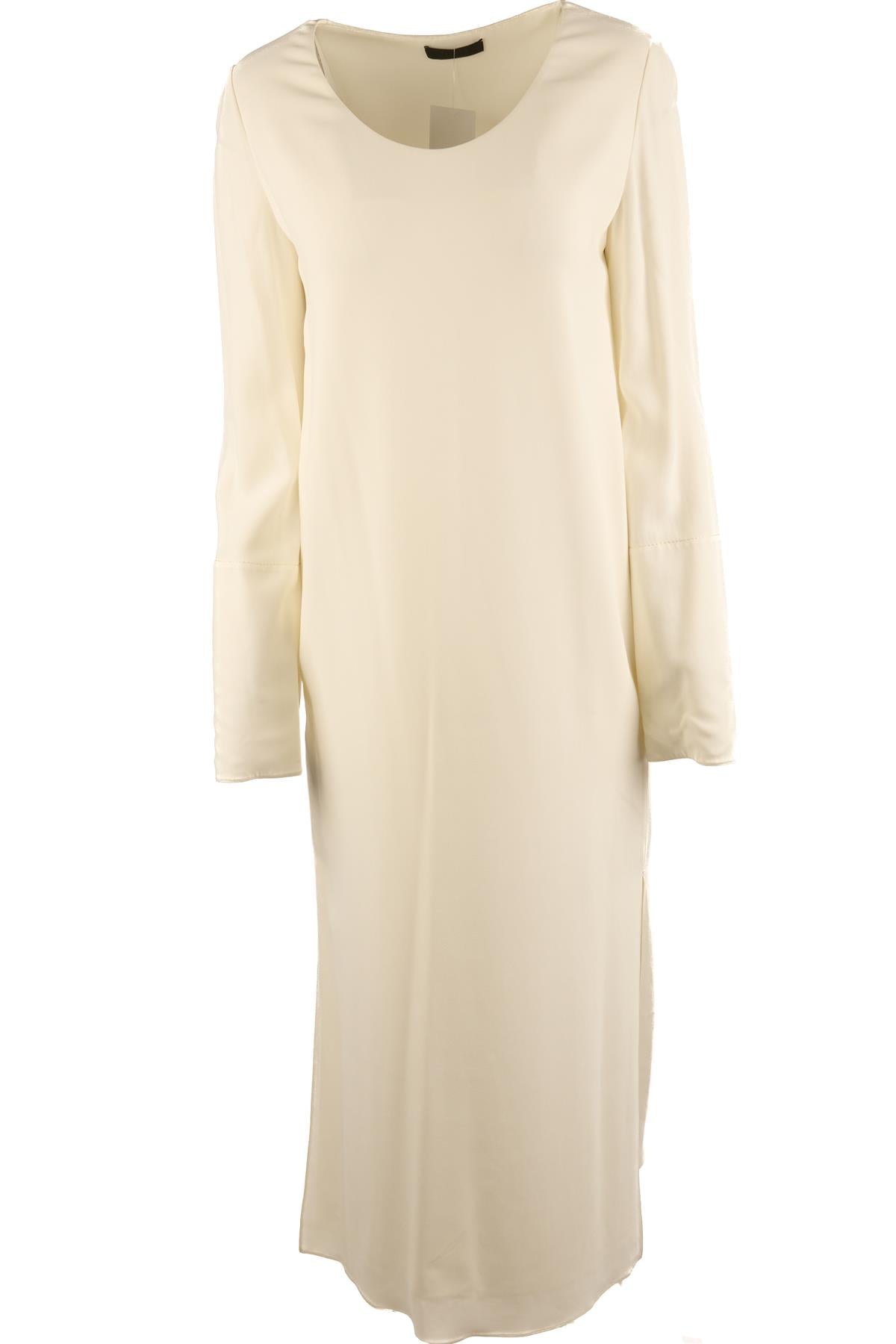 The Row White Crepe Midi Dress. Cream. Long Sleeve. Crewneck. Slips on. 95% Viscose, 5% Elastane, 97% Cotton, 3% Elastane. US 4 (UK 8, FR 36, IT 40). Bust: 36 in. Waist: 40 in. Hips: 42 in. Length: 50 in.
