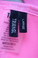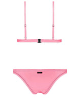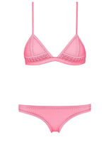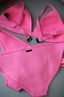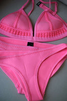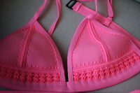 Crochet + Neoprene Bikini in Hot Pink. Blanket Stitch + Crochet. Bra style top. Adjustable shoulder straps. Back clasp fastening. Blanket Stitch. Classic Bikini Bottom. High-curved sides. Comes with two bottoms.
