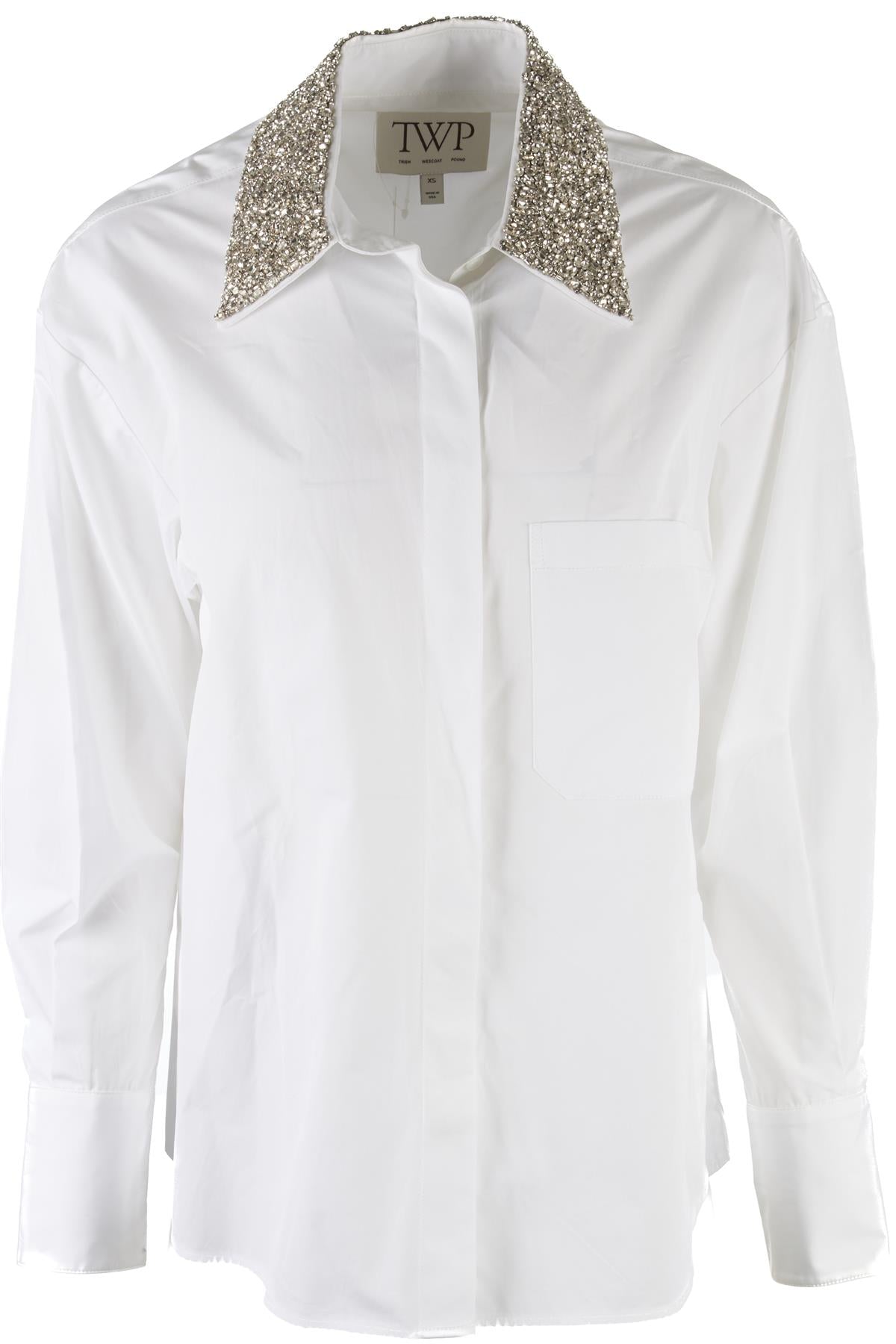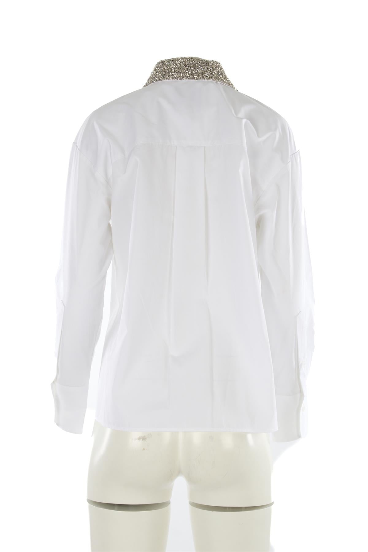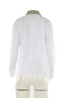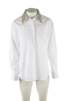 Twp White Cotton Shirt. White and silver. Long Sleeve. Crewneck. Button fastening - Front. 100% Cotton. XSmall (UK 6, US 2, FR 34, IT 38). Bust: 38 in. Waist: 41 in. Hips: 43 in. Length: 26 in.
