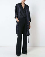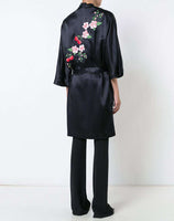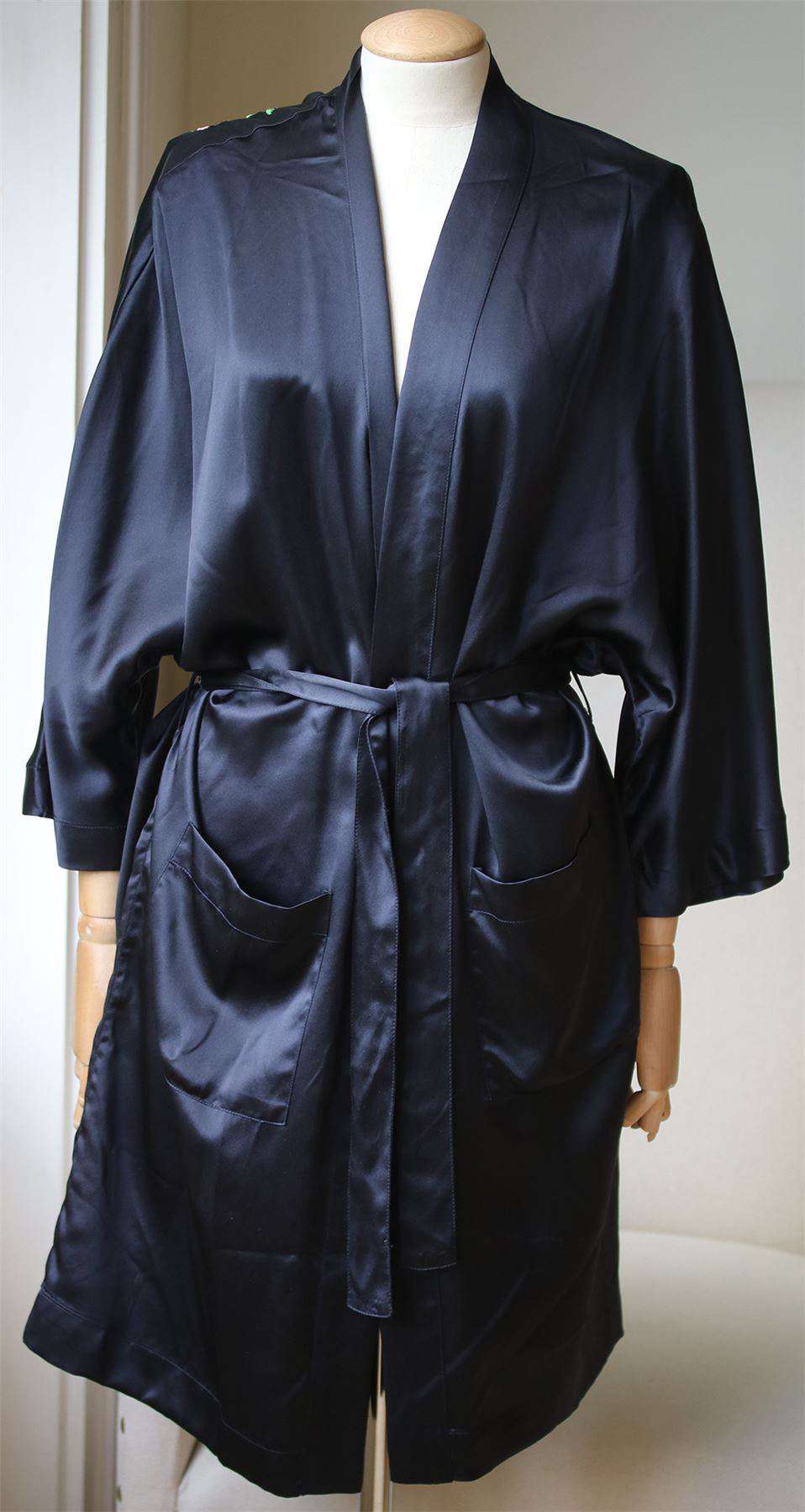 Anine Bing silk embroidered kimono with floral embroidery. Satin effect. Bow fastening. Wide long sleeves. 100% Silk. Colour: navy.