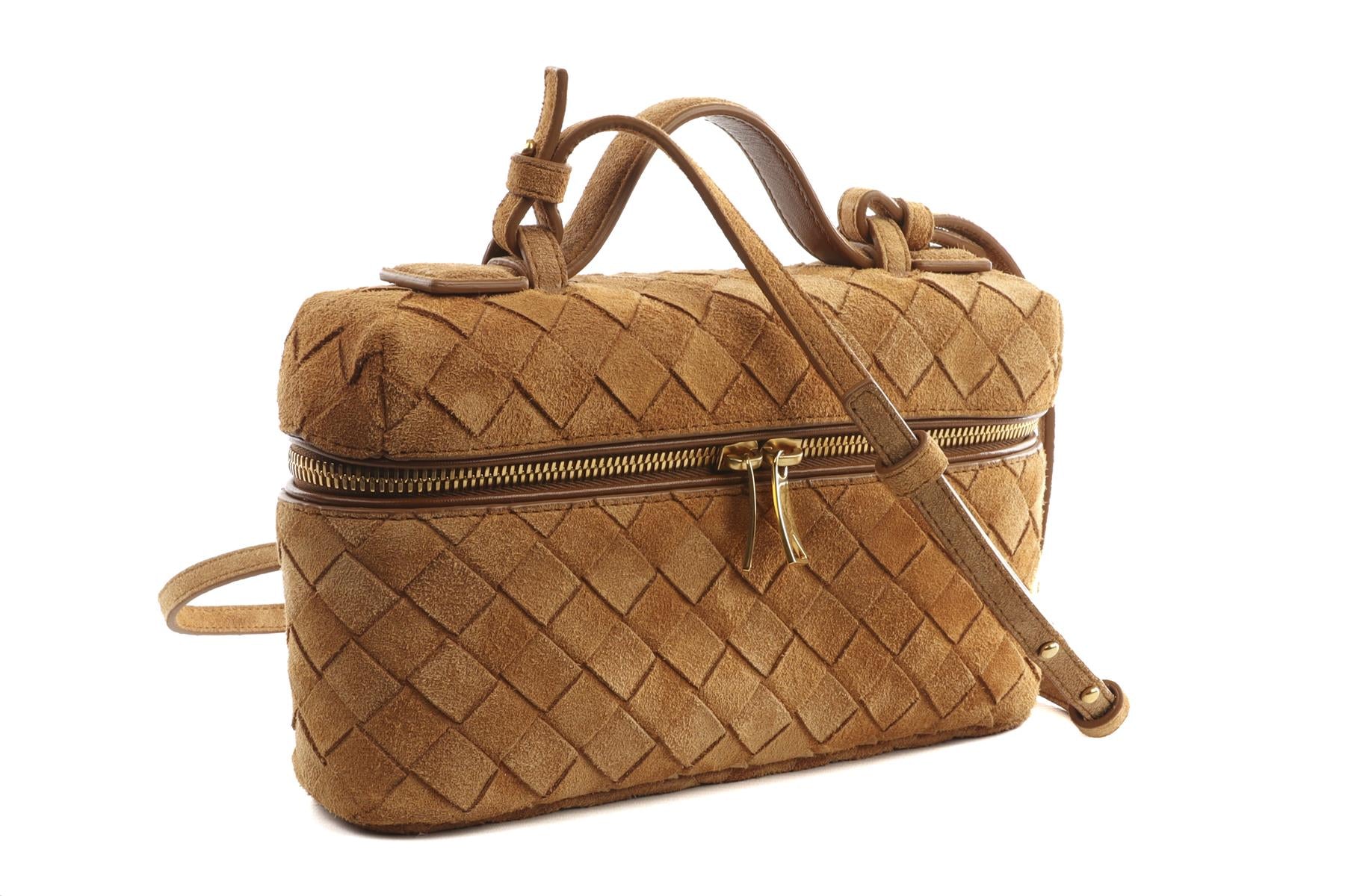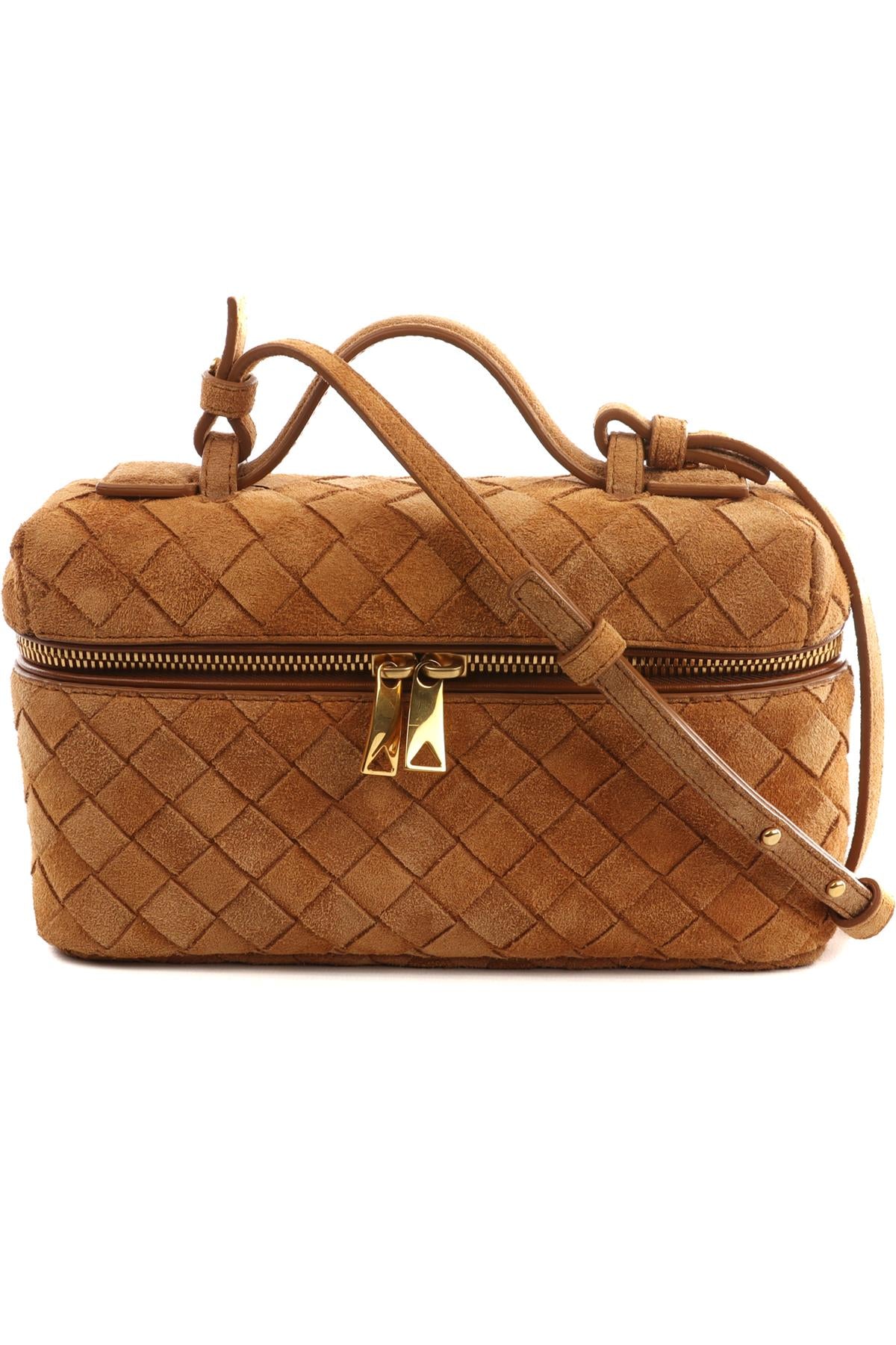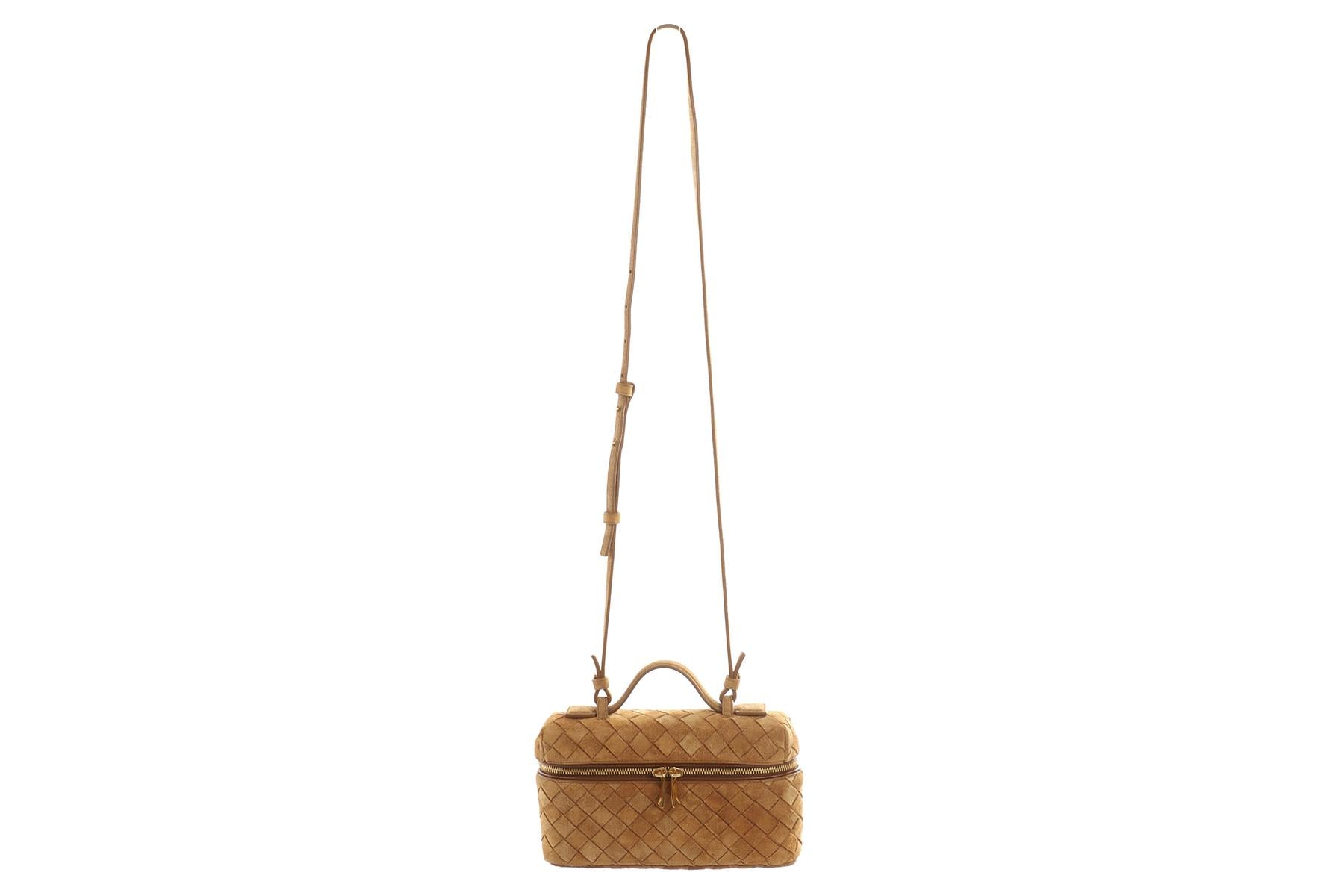 Bottega Veneta Tan Bang Bang Vanity Mini Intrecciato Suede Tote Bag. Tan. Zip fastening - Front. Does not come with - dustbag or box. One Size.. Height: 5.5 in. Width: 9 in. Depth: 2.5 in. Handle drop: 1.5 in. Strap drop: 23 in.