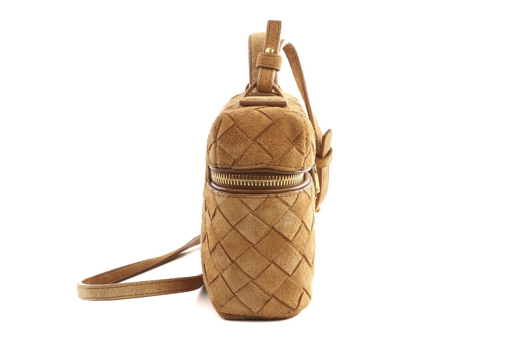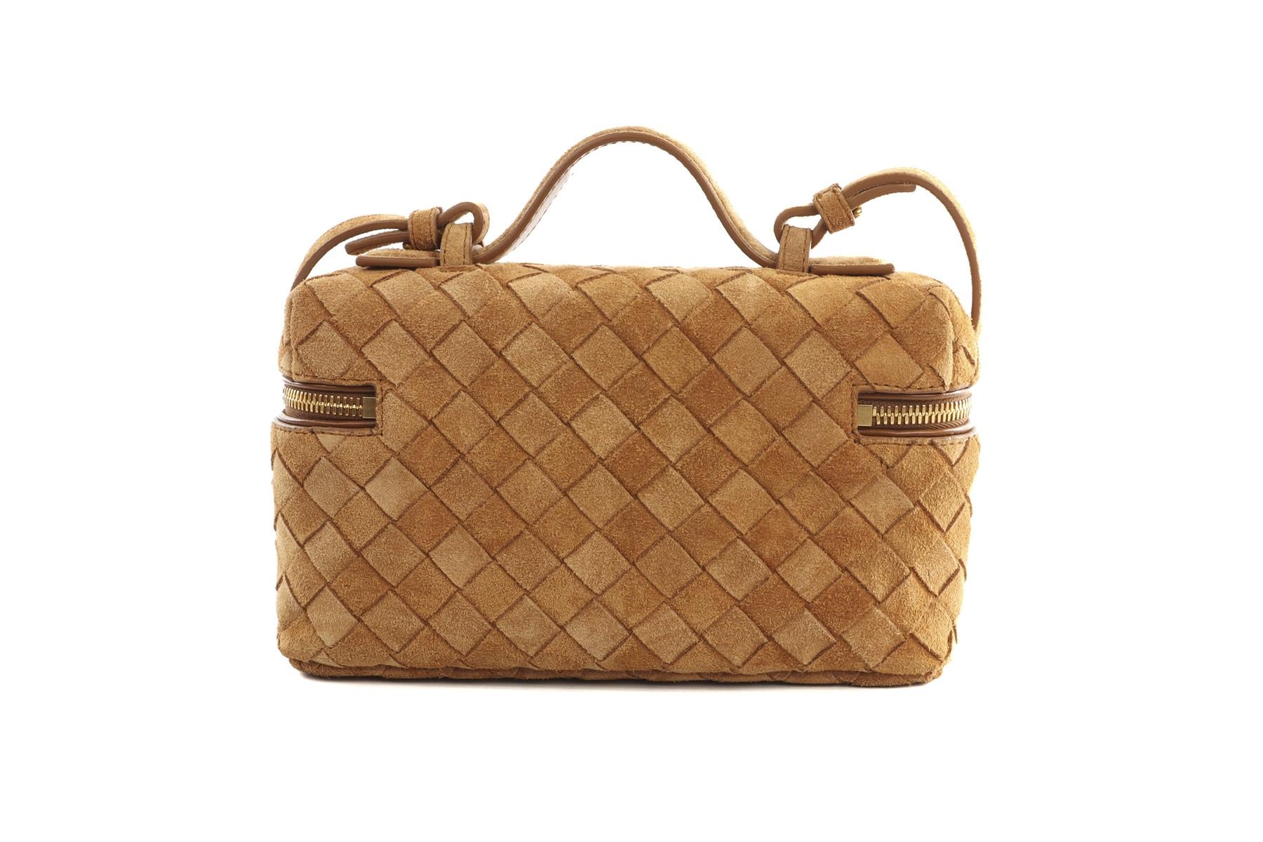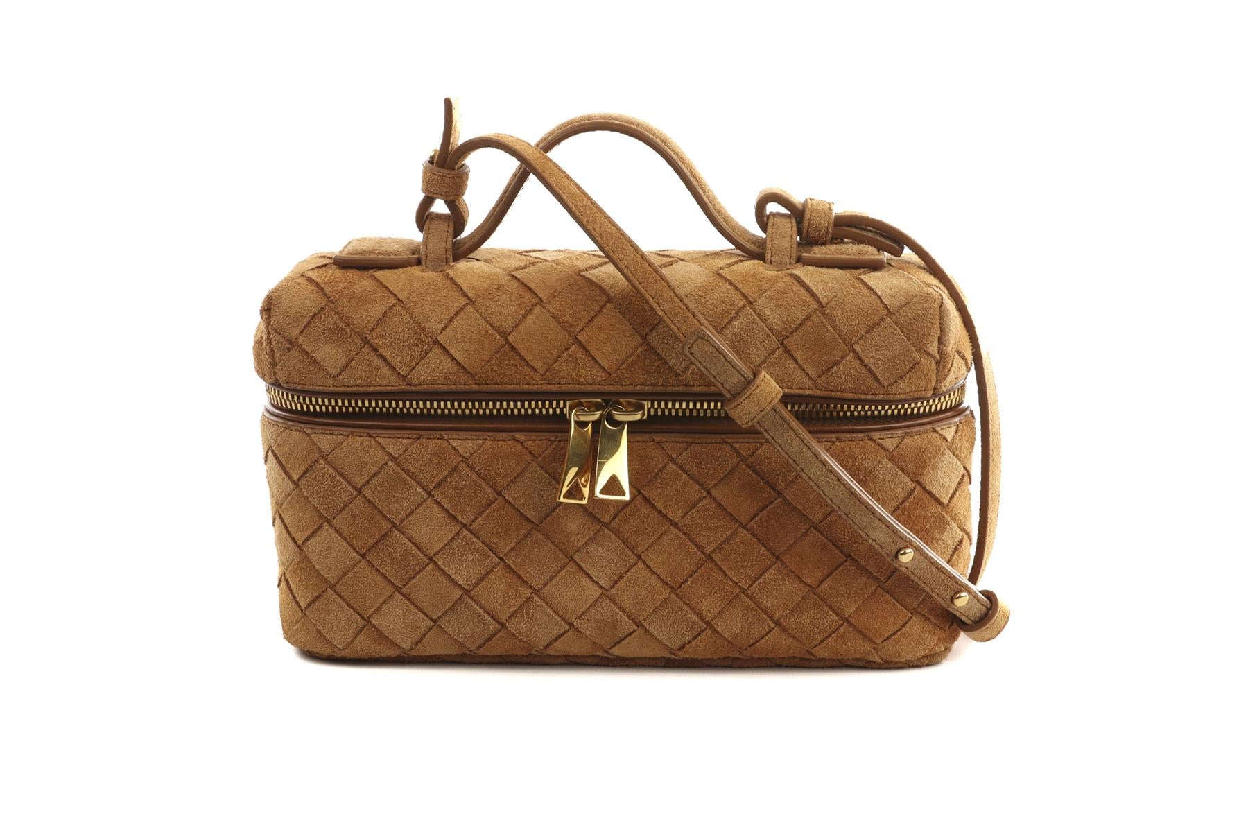 Bottega Veneta Tan Bang Bang Vanity Mini Intrecciato Suede Tote Bag. Tan. Zip fastening - Front. Does not come with - dustbag or box. One Size.. Height: 5.5 in. Width: 9 in. Depth: 2.5 in. Handle drop: 1.5 in. Strap drop: 23 in.