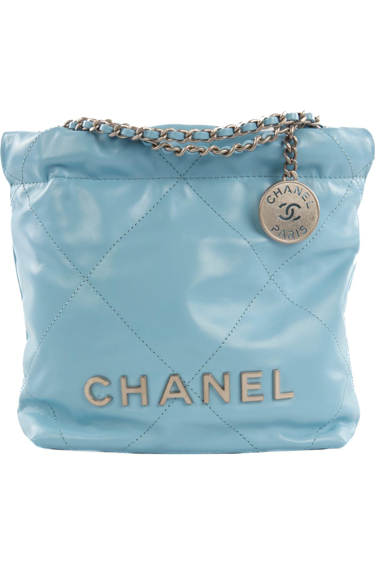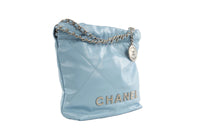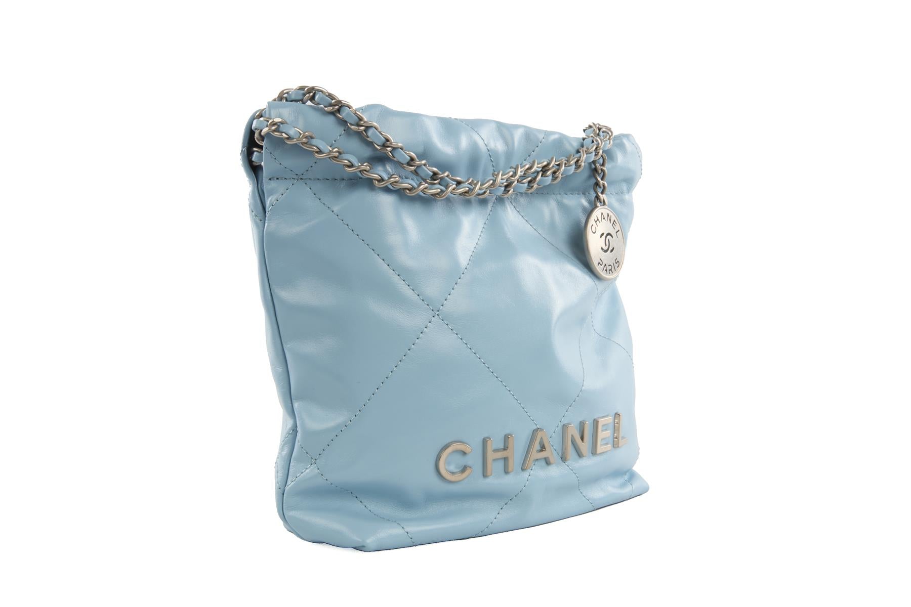 Chanel Blue 2023 22 Mini Quilted Leather Shoulder Bag. Blue. Open Top. Does not come with - dustbag or box. Chanel 22. Height: 8 in. Width: 9.5 in. Depth: 3 in. Handle drop: 3 in. Strap drop: 21 in.