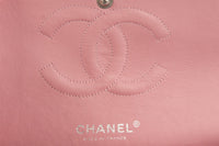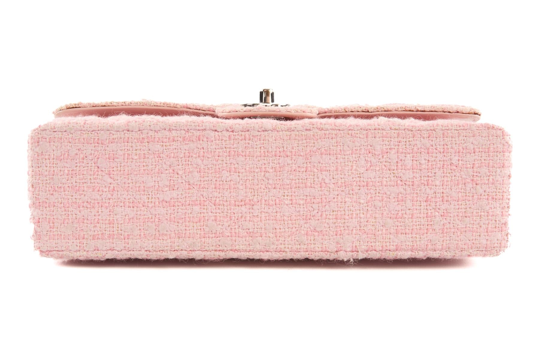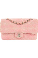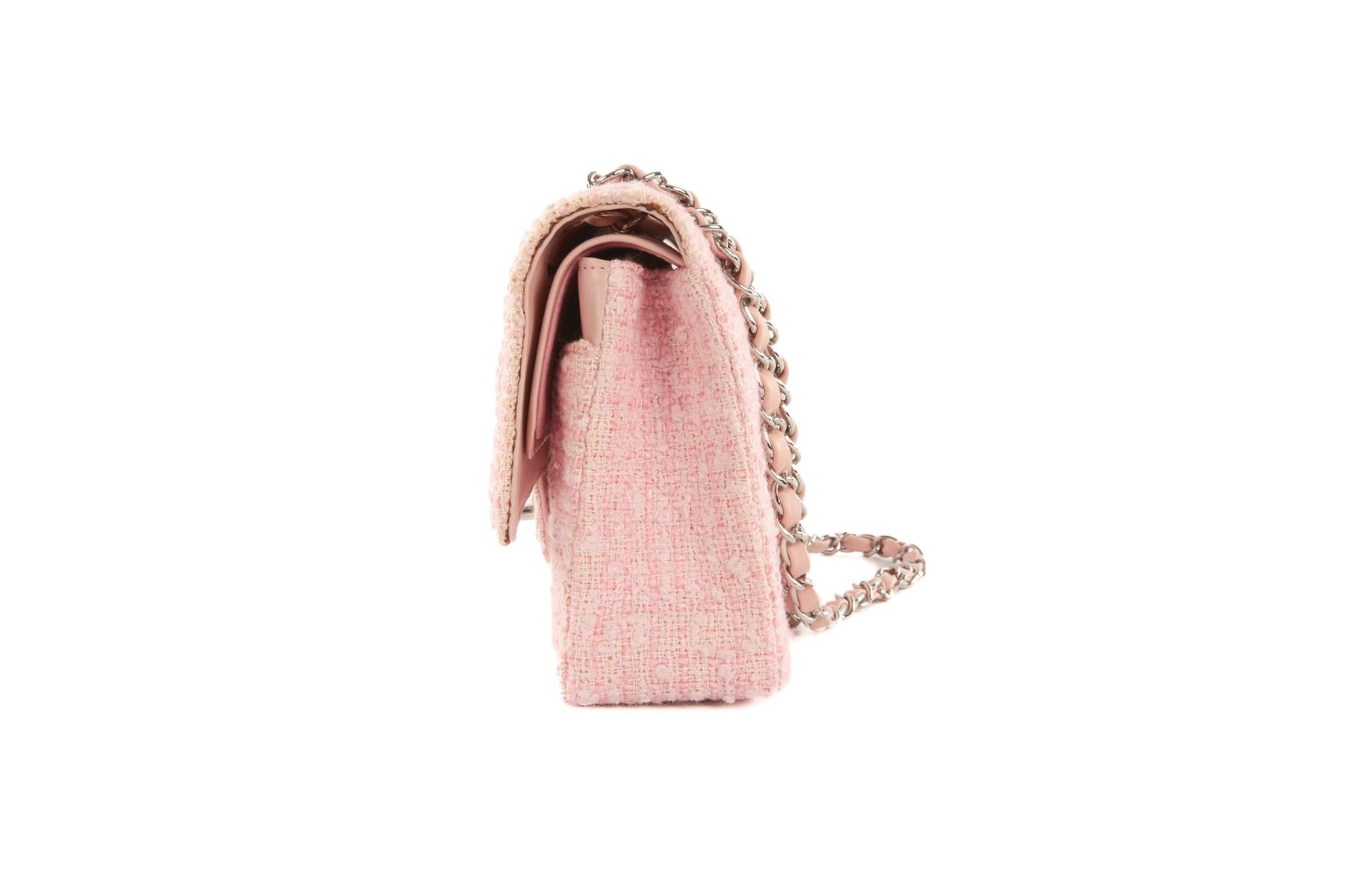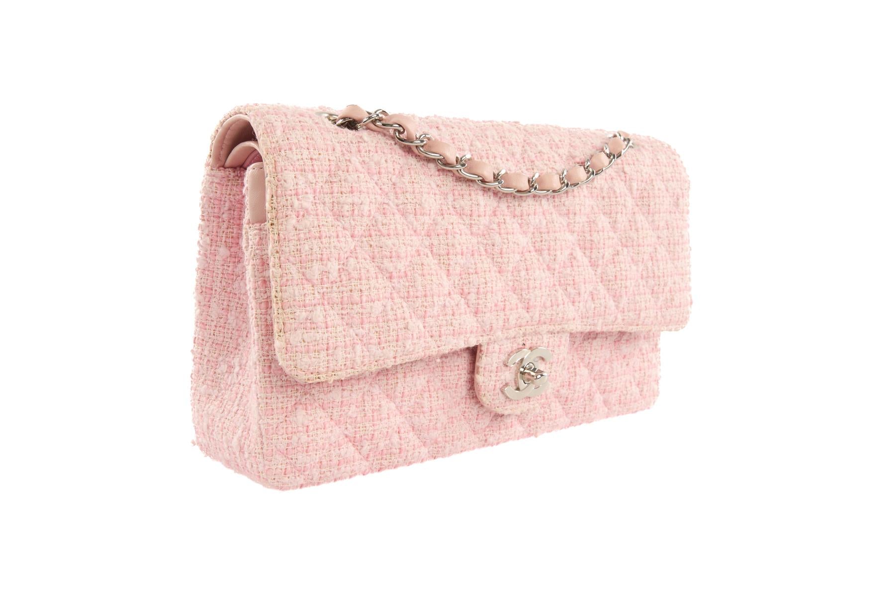 Chanel Pink 2003-2004 Classic Double Flap Medium Tweed Shoulder Bag. Pink. Twist lock fastening - Front. Comes with - authenticity card. Height: 6 in. Width: 10 in. Depth: 3 in. Strap drop: 16 in.